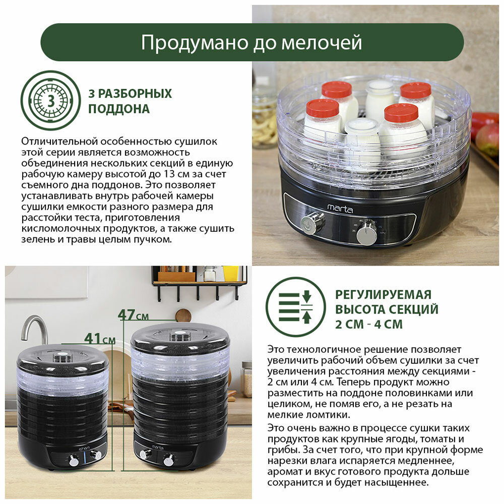 Дегидратор сушилка для овощей электросушилка MARTA MFD-8010PS йогуртница 13 поддонов (10 основных + 3 для пастилы) темный обсидиан