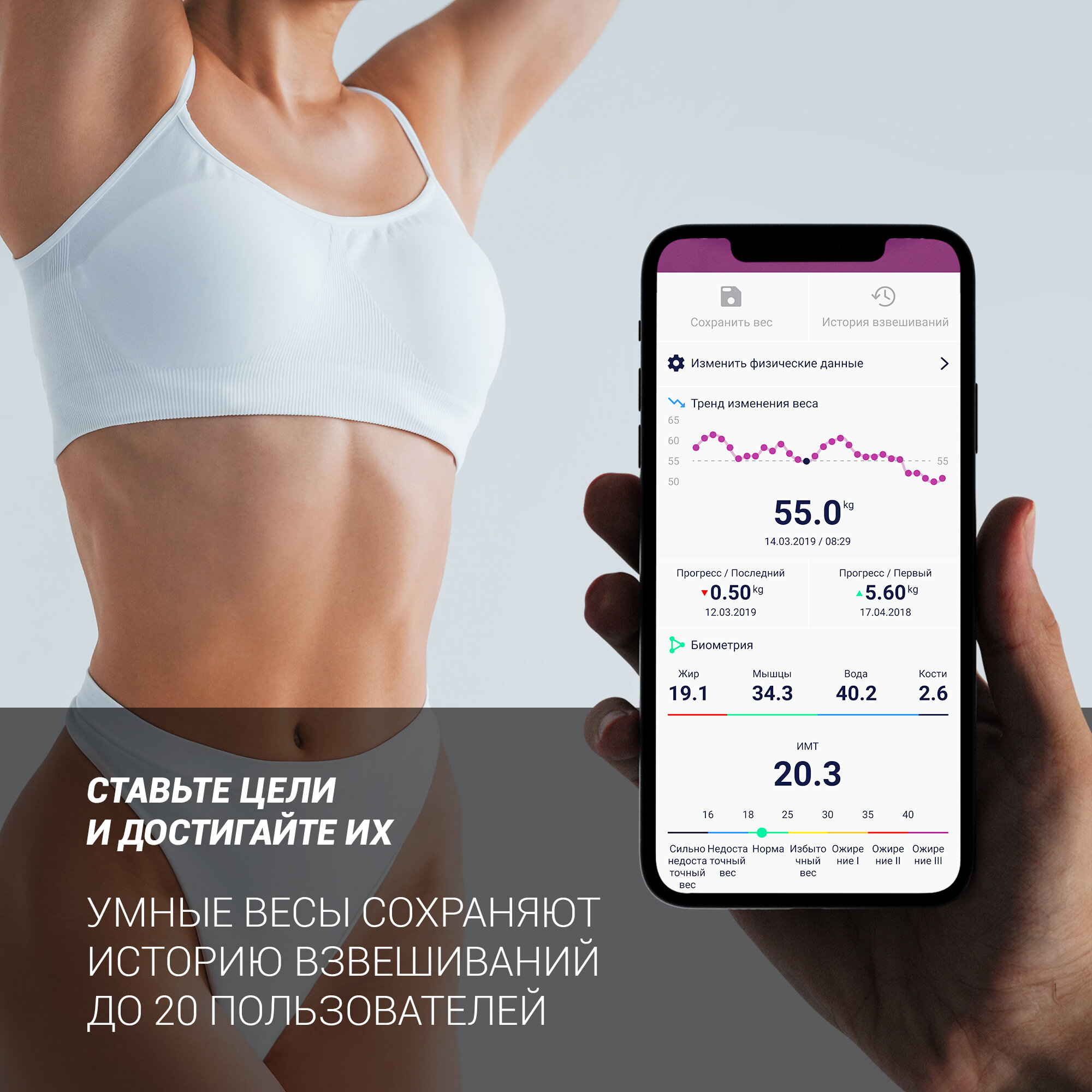 Приложение так же по известным формулам рассчитывает индекс массы и вес различных фракций тела. |