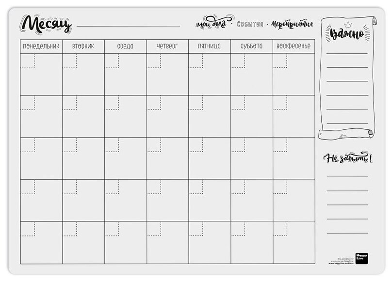 Планер на месяц HappyLine, белый, 48*34см, стираемая поверхность - 3 шт.