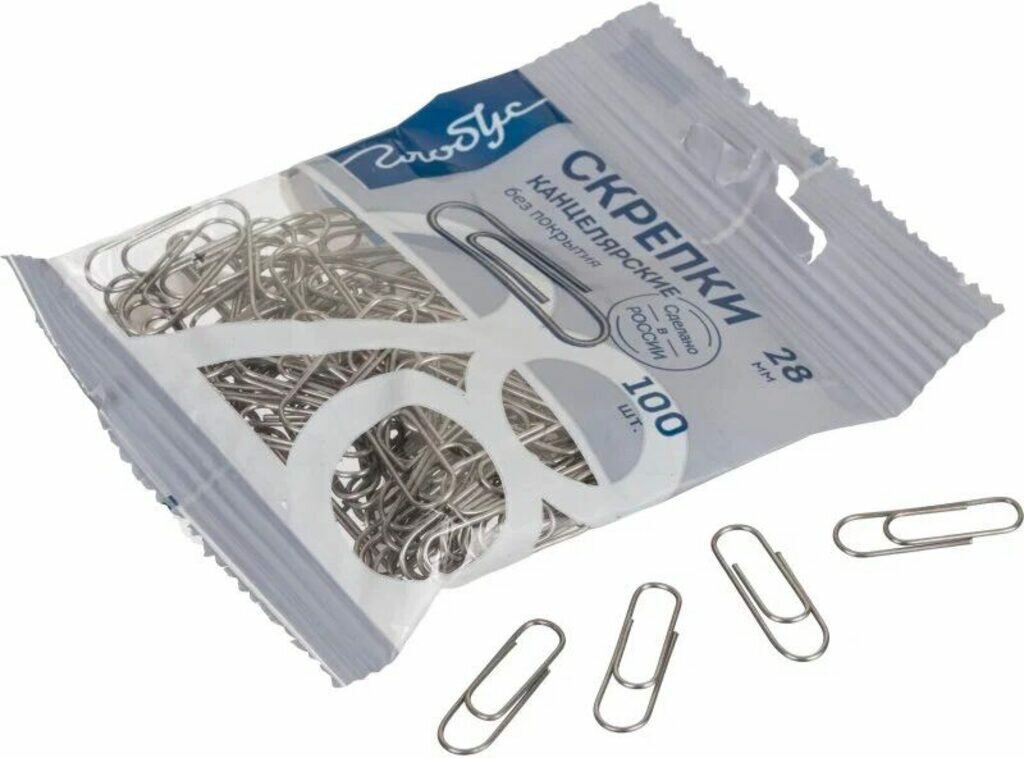 Скрепки канцелярские, 100 шт., 28 мм, без покрытия, флоу-пак