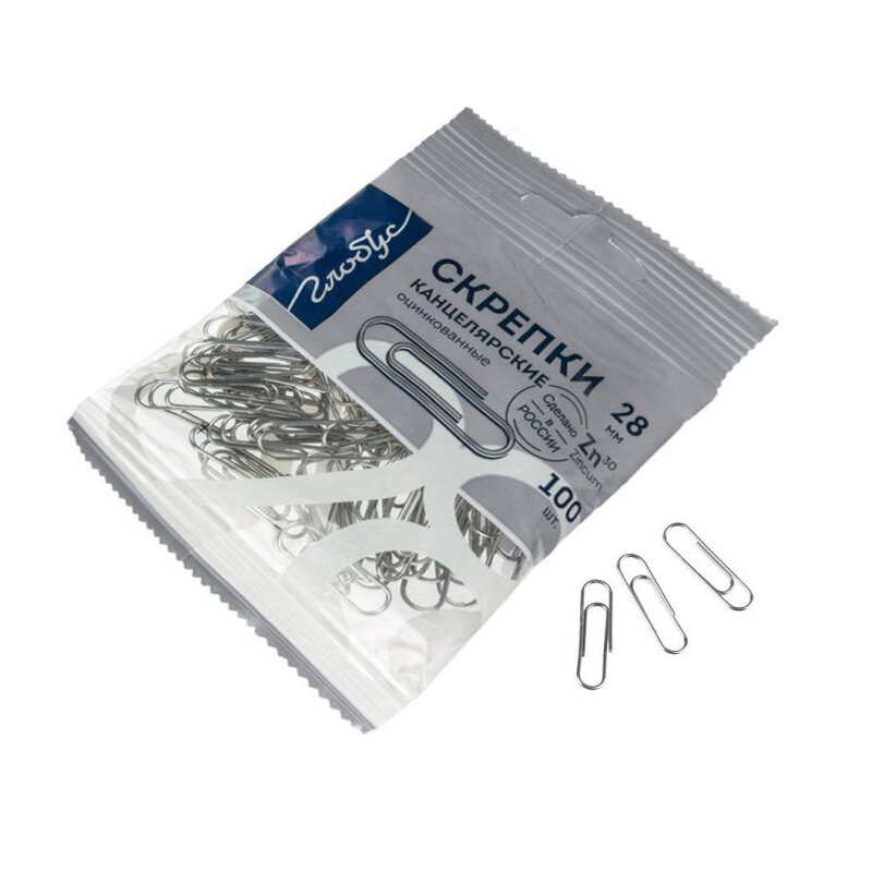 Скрепки Глобус С28-100ЦПл, 28 мм, 100 шт. цинк, в пакете с европо
