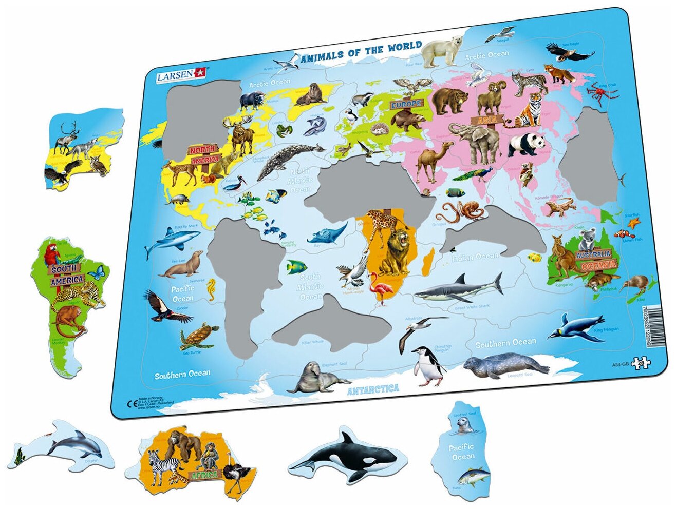 Пазлы для детей Larsen "Карта мира с животными", 28 элементов, A34 интересное: