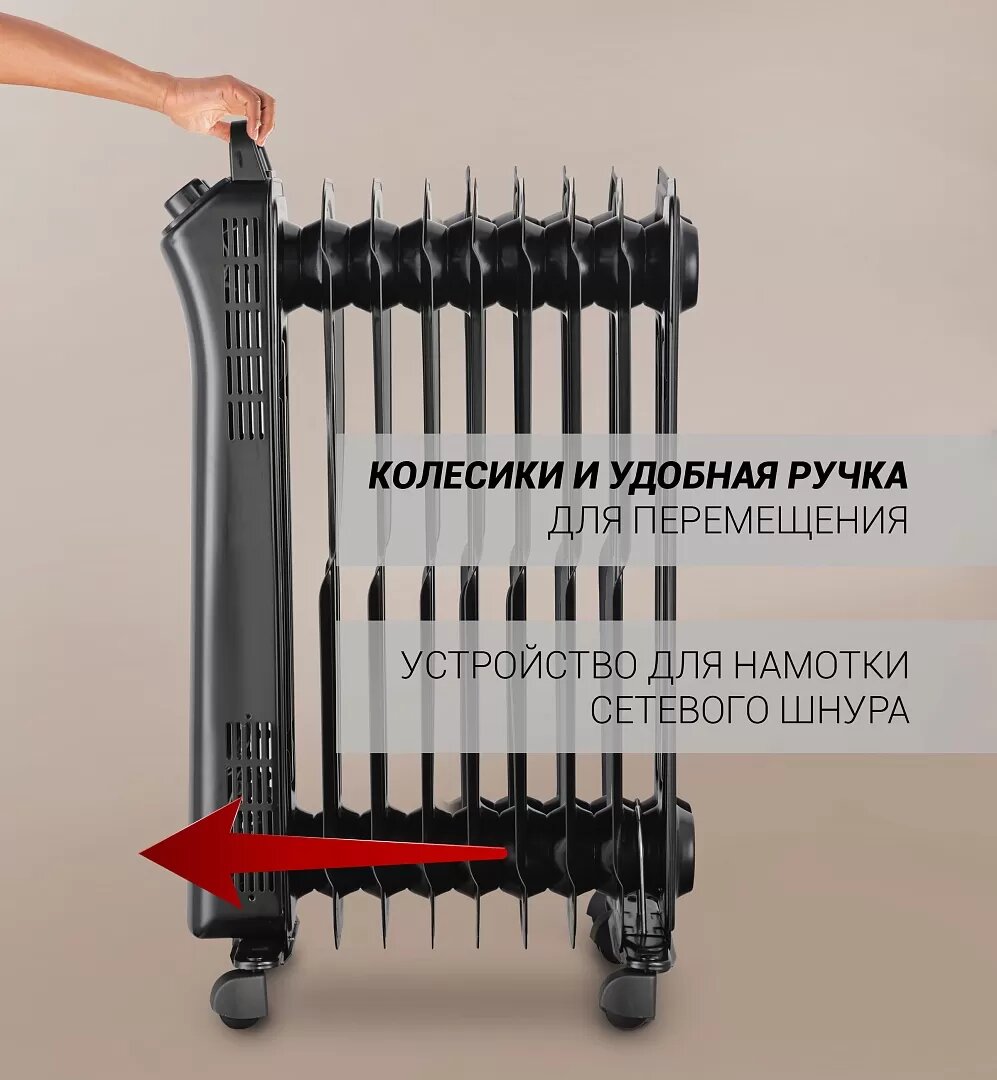 Масляный радиатор Polaris POR 0420, 2 кВт, 22 м², колеса в комплекте, черный