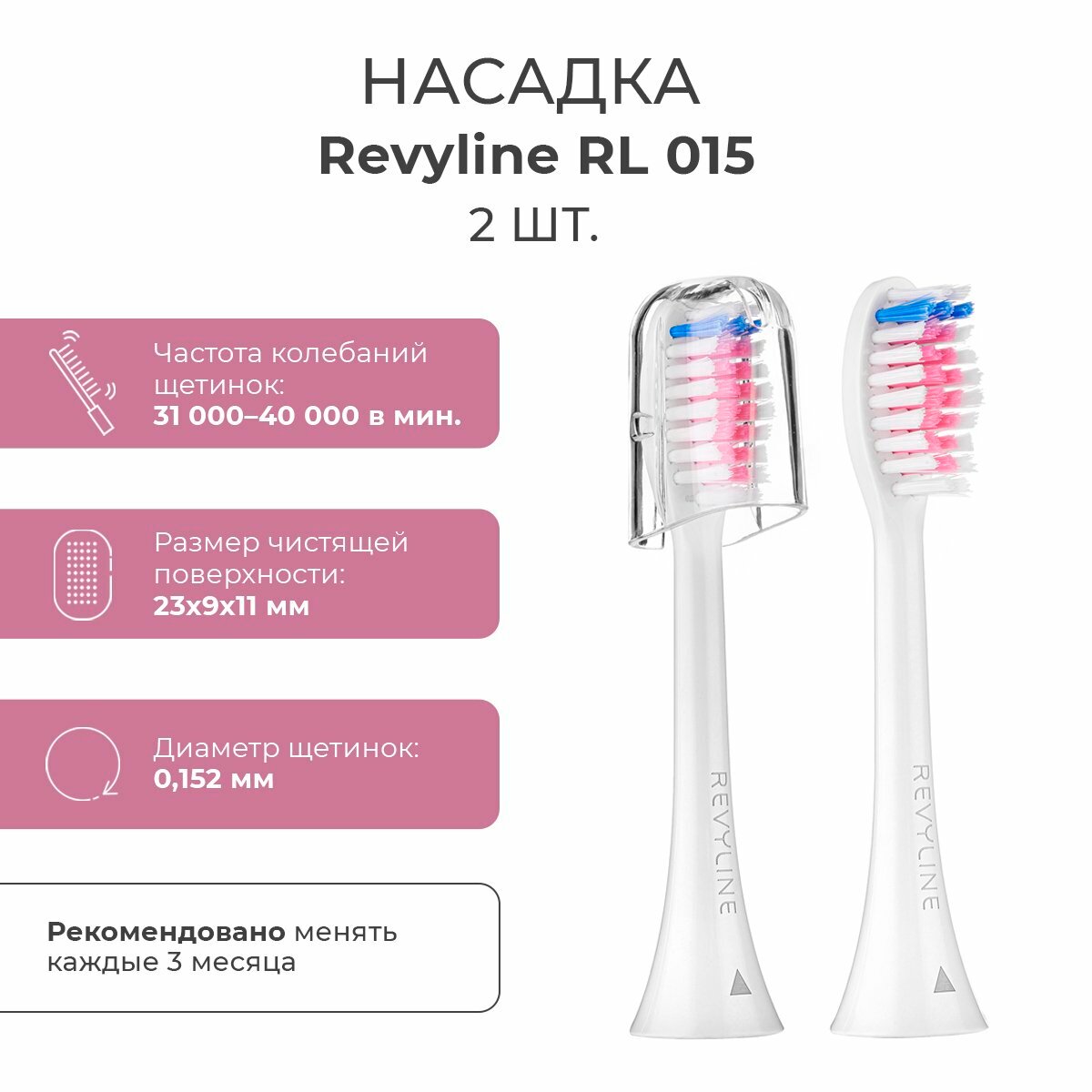 Сменные насадки для электрической зубной звуковой щетки Revyline RL 015, розовые, 2 шт.