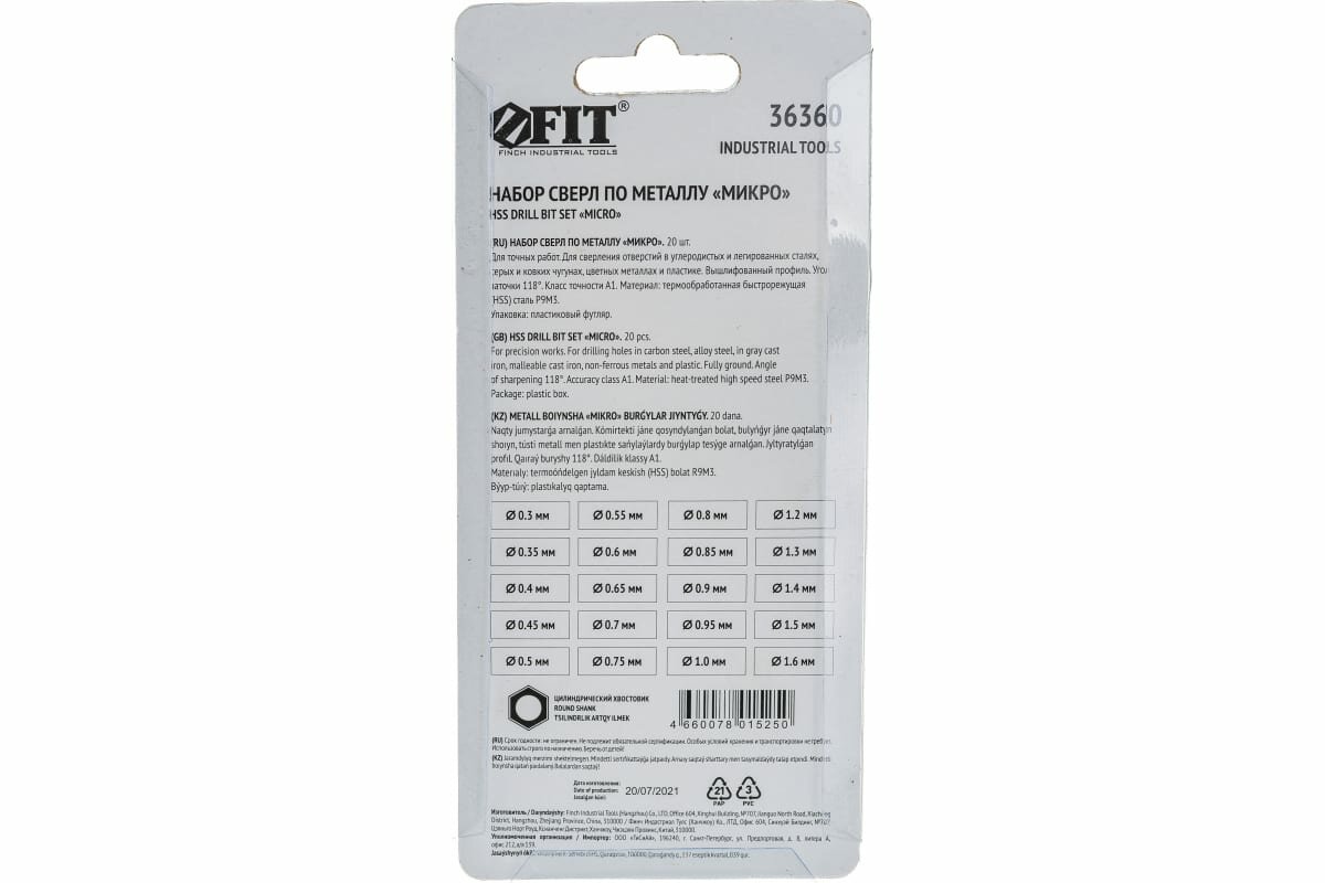 Fit Буры,сверла,долото IT Сверла по металлу HSS полированные "микро" набор 20 шт. 0,3-1,6 мм 36360