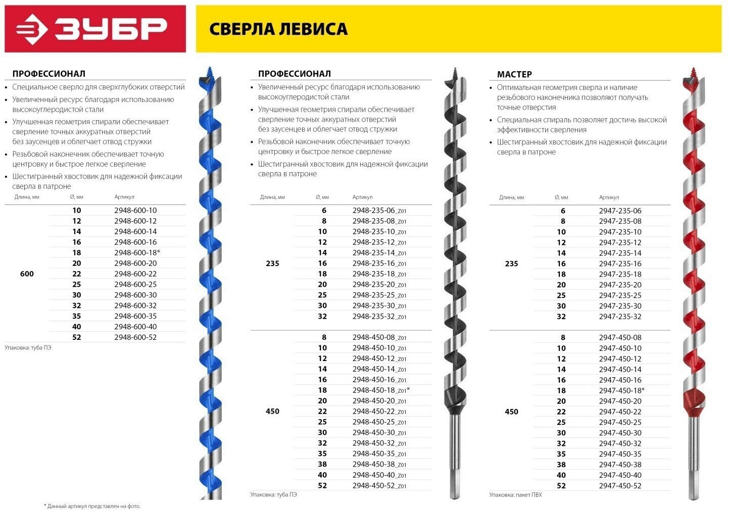 Сверло левиса по дереву, Зубр 8x235/160мм, шестигранный хвостовик 2948-235-08_z01 .