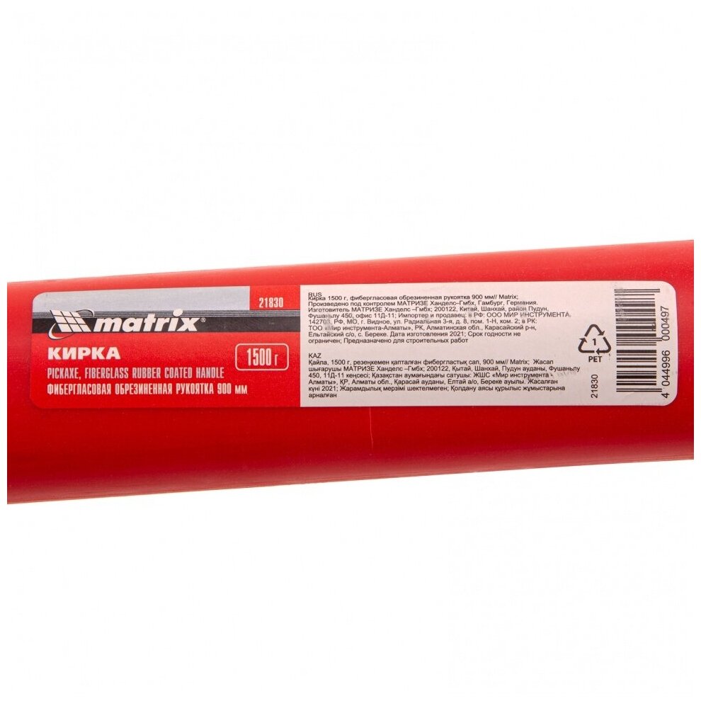 Кирка MATRIX 21830, фибергласовая обрезиненная рукоятка 900 мм, 1500 г