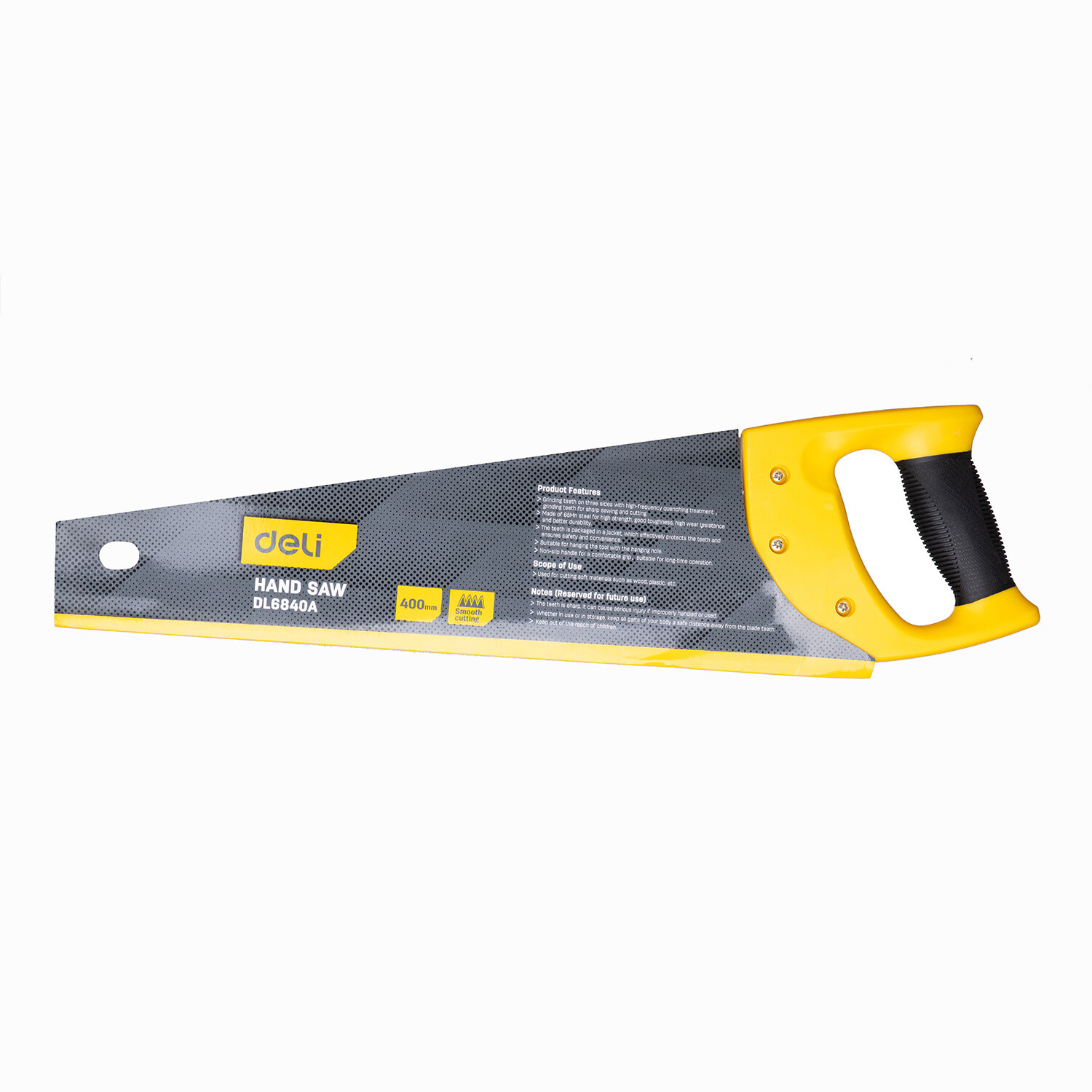 Ножовка по дереву Deli DL6840A 400мм Материал: 65Mn. Термообработанная поверхность. Шлифовка зубов с 3-х сторон. Литая ручка из двухкомпонентного противоударного пластика.