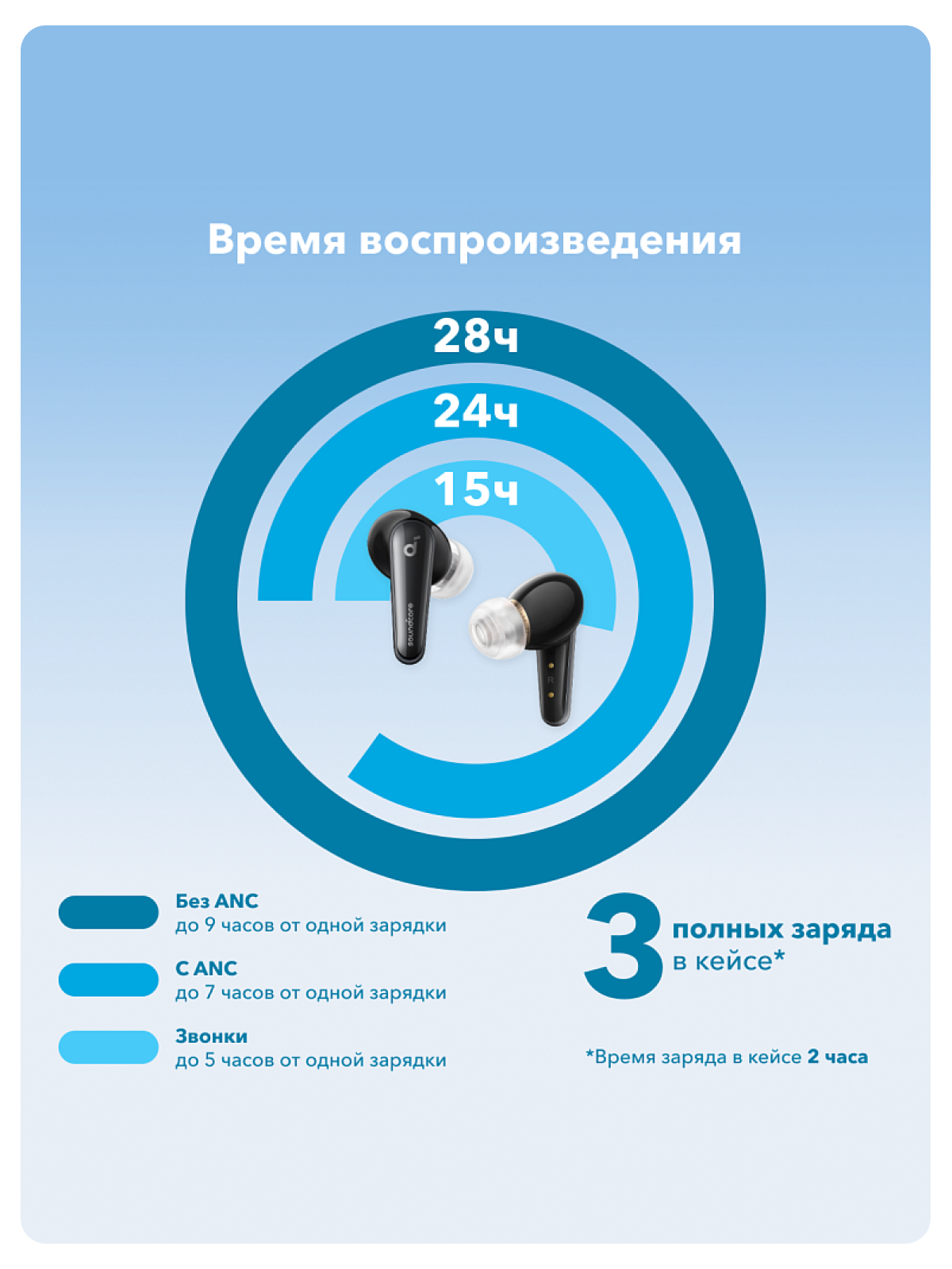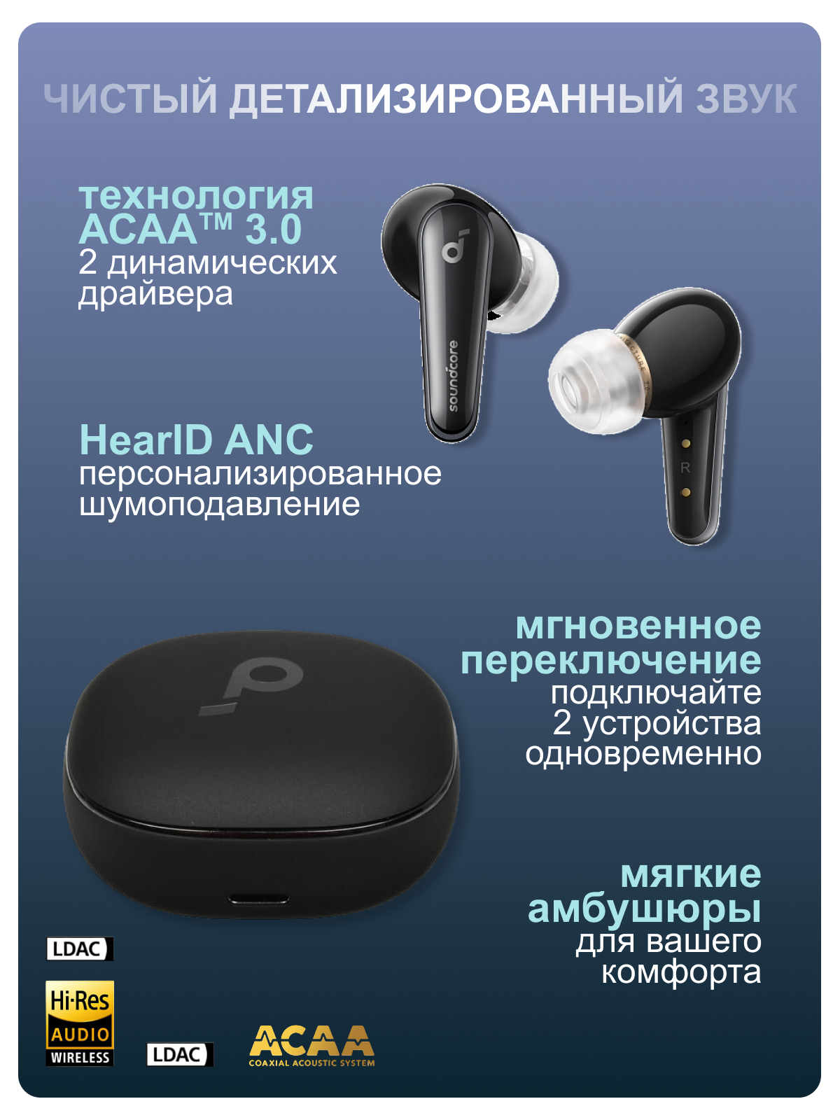 | Дополнительная информация | приложение soundcore App, объемное аудио 360°, поддержка быстрой и беспроводной зарядки, Амбушюры CloudComfort |