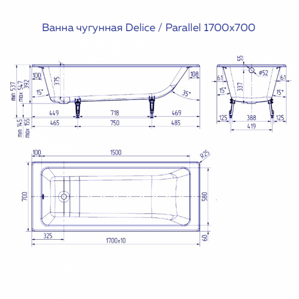 Ванна чугунная Delice Parallel 1700х700, без ручек