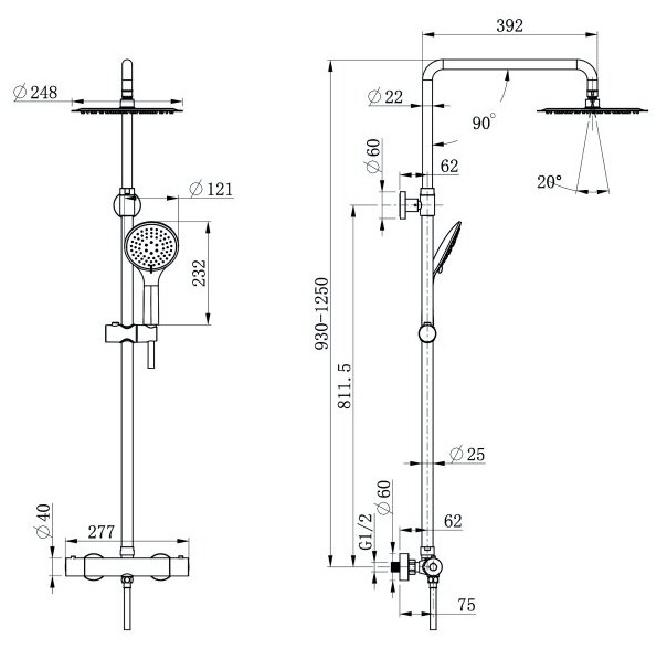 | Особенности | держатель душевой лейки / регулируемый верхний душ |