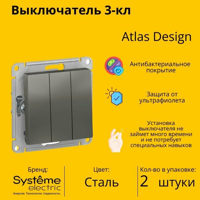 2 шт. Systeme Electric AtlasDesign Сталь Выключатель 3-клавишный сх.1+1+1, 10АХ, механизм, ATN000931