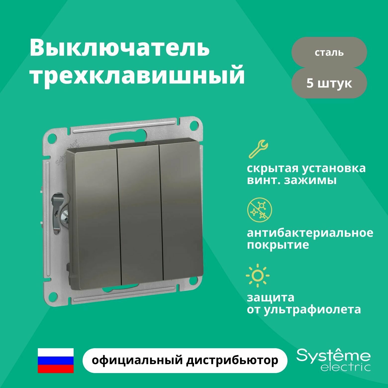 Купить Выключатель трехклавишный Schneider Electric (Systeme Electric) Atlas Design механизм сталь ATN000931 5шт