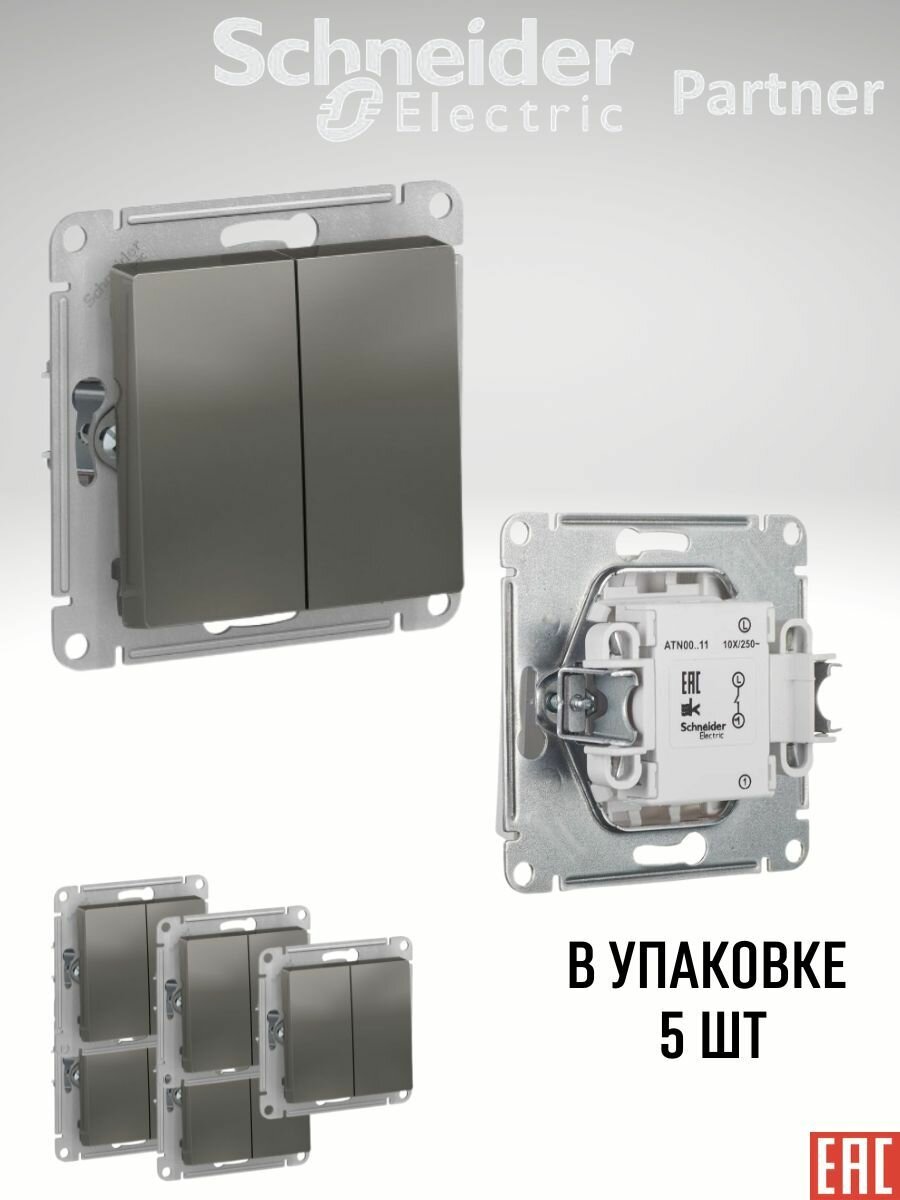 Переключатель двухклавишный мокко сх.6, 10АХ, механизм Schneider Electric AtlasDesign (комплект 5шт)