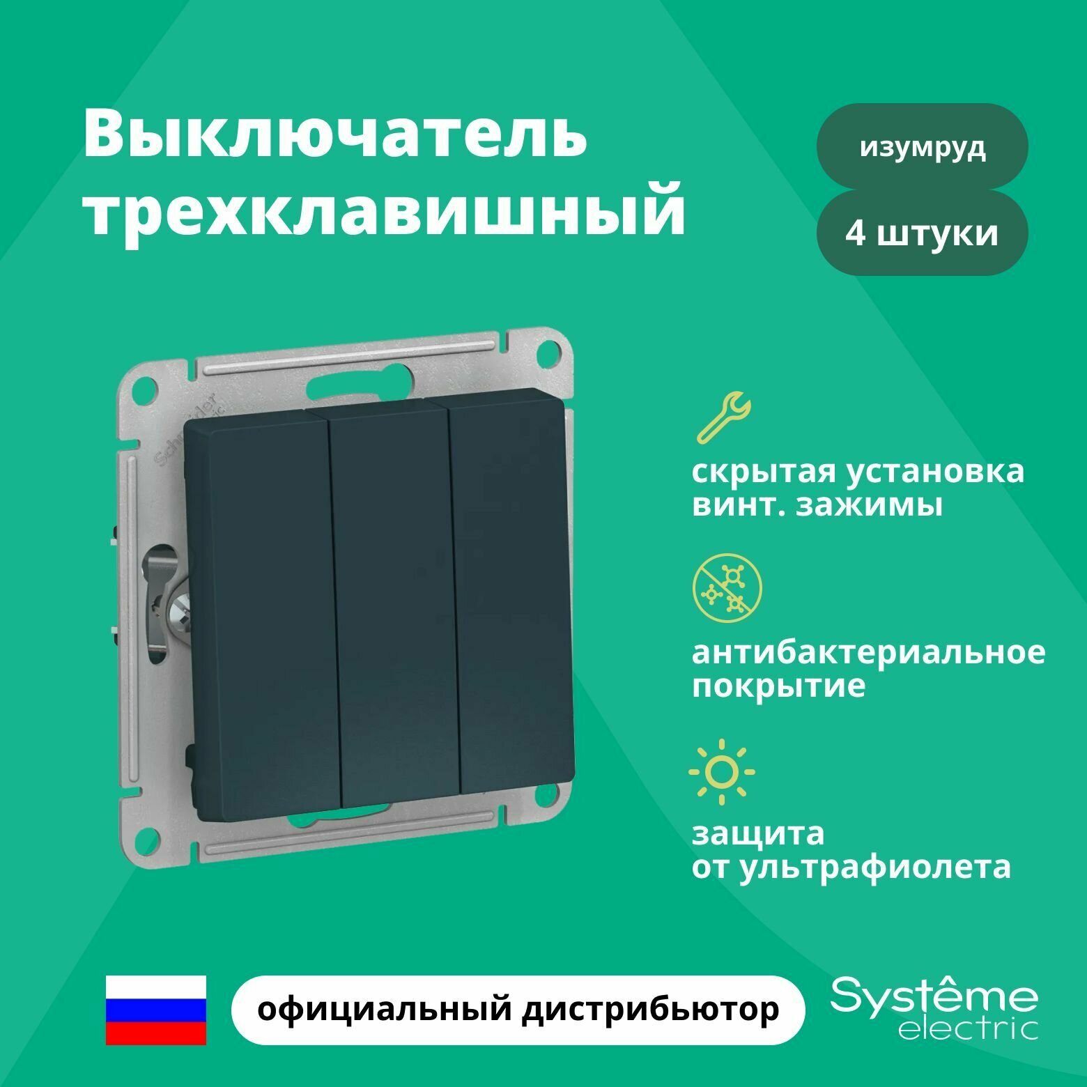 Купить Выключатель 3-кл. СП AtlasDesign 10А IP20 (сх. 1+1+1) 10AX механизм изумруд | код ATN000831 | Schneider Electric (4шт.в упак.)