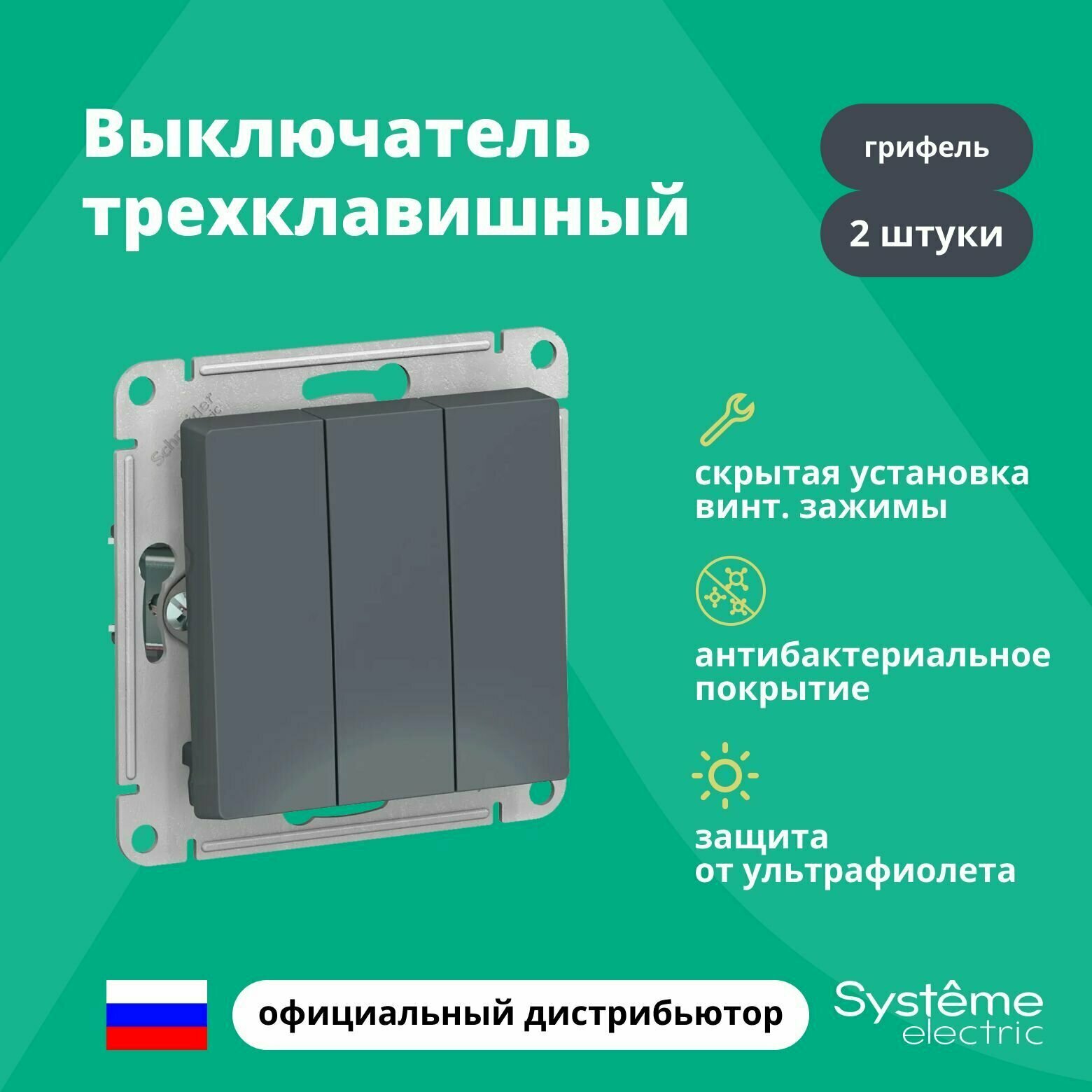 3 шт. Systeme Electric AtlasDesign Изумруд Выключатель 2-клавишный сх.5, 10АХ, механизм, ATN000851