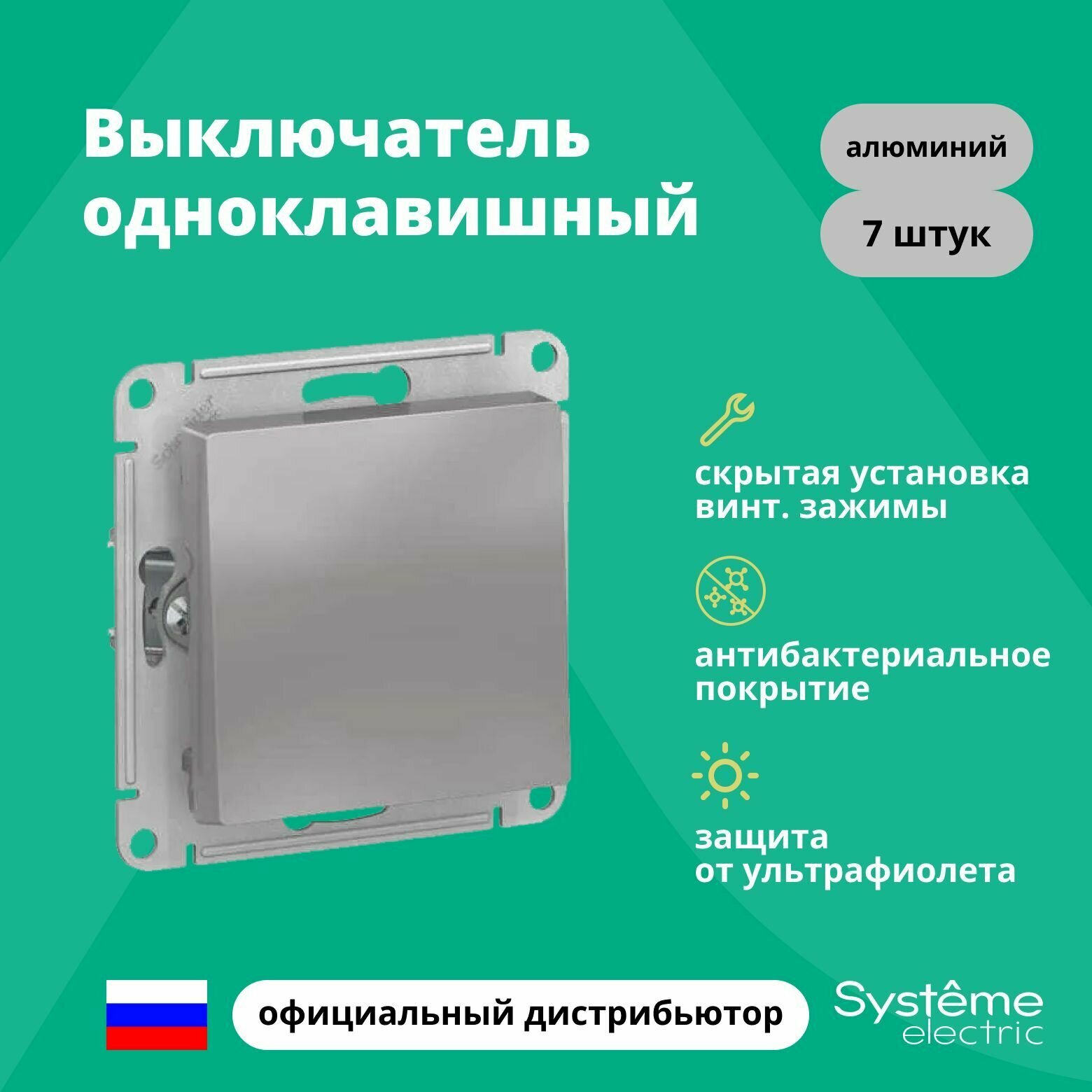 6 шт. Systeme Electric AtlasDesign Алюминий Переключатель 1-клавишный, сх.6, 10АХ, механизм ATN000361