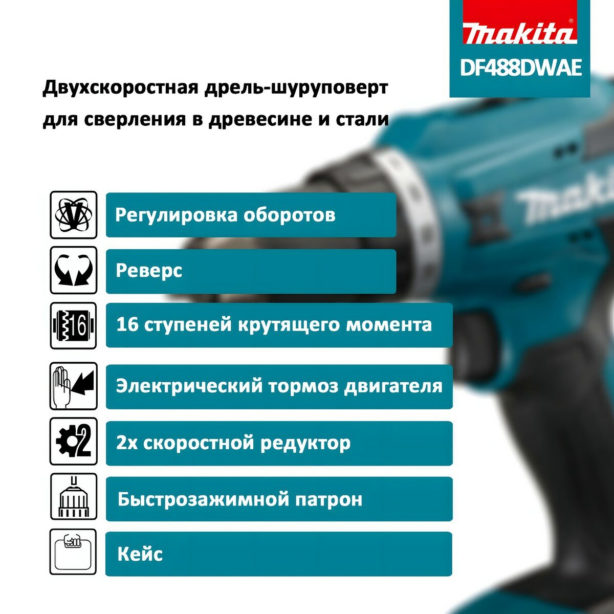 Аккумуляторная дрель-шуруповерт Makita DF488DWAE, с 2 АКБ 2 Ач и ЗУ, в кейсе
