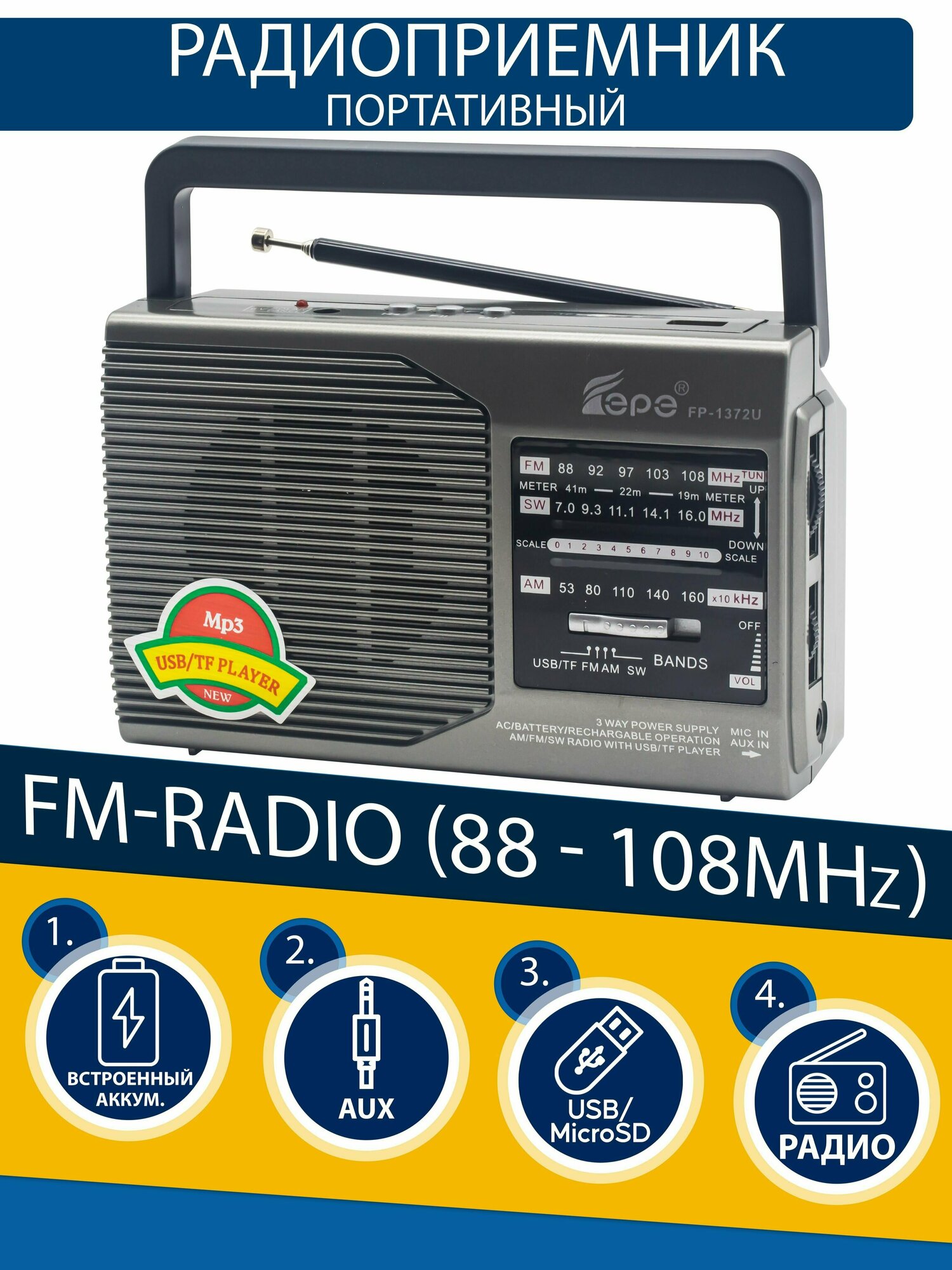 Радиоприемник AM-FM-SW, питание от сети 220В, на батарейках FP-1372U серебро Fepe интересное: