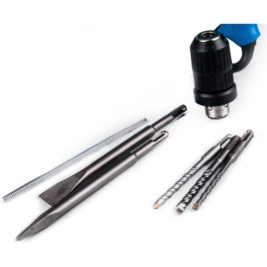 | Комплектация | дополнительная рукоятка, дополнительный быстрозажимной патрон, 3 бура SDS PLUS, пика SDS PLUS, зубило SDS PLUS, ограничитель глубины, кейс |