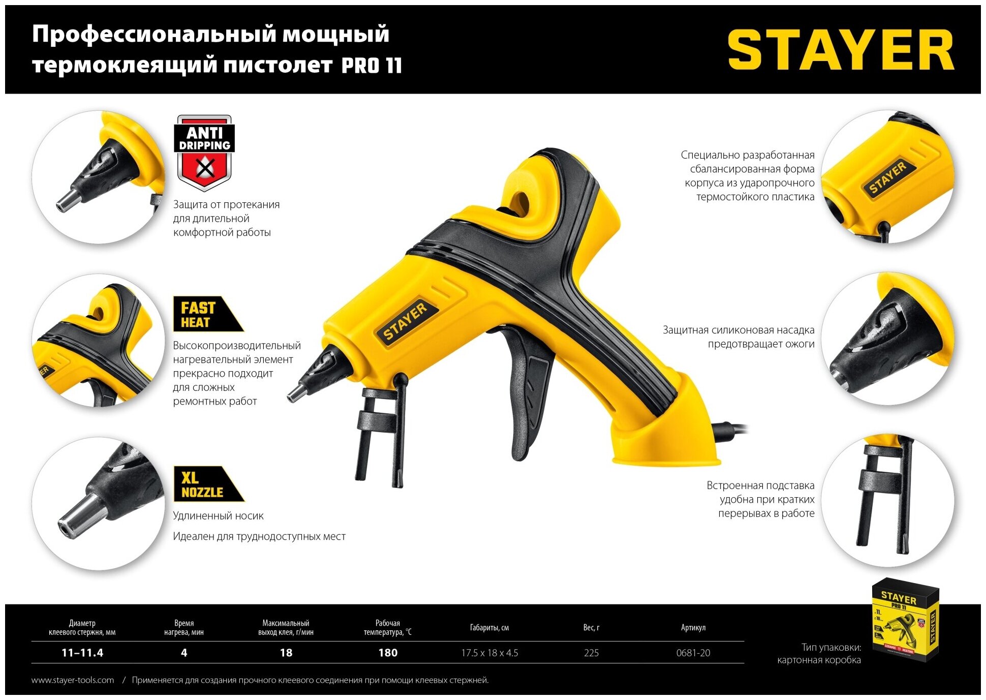 Пистолет термоклеевой электрический STAYER PRO, 11 мм, выход клея 18 г/мин, PRO 11, 0681-20