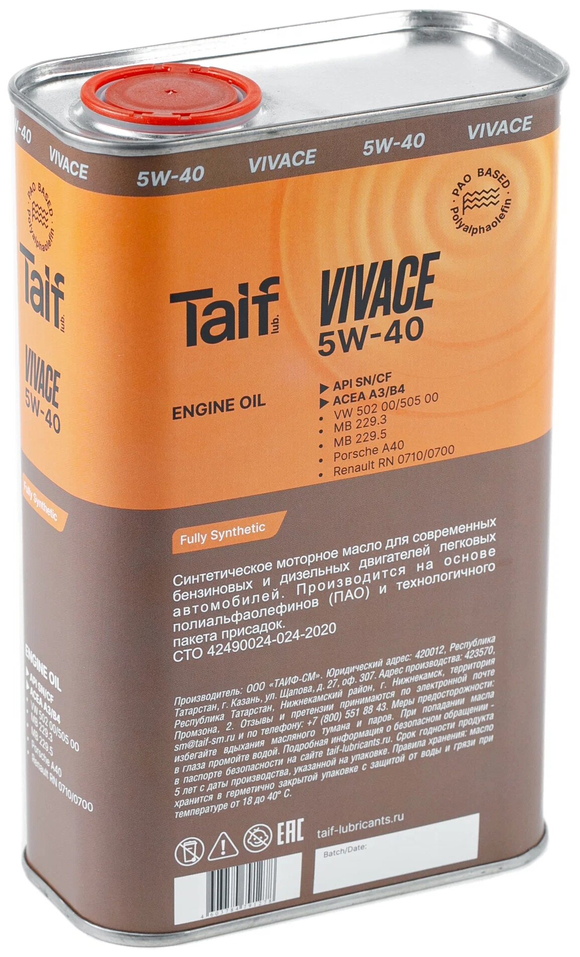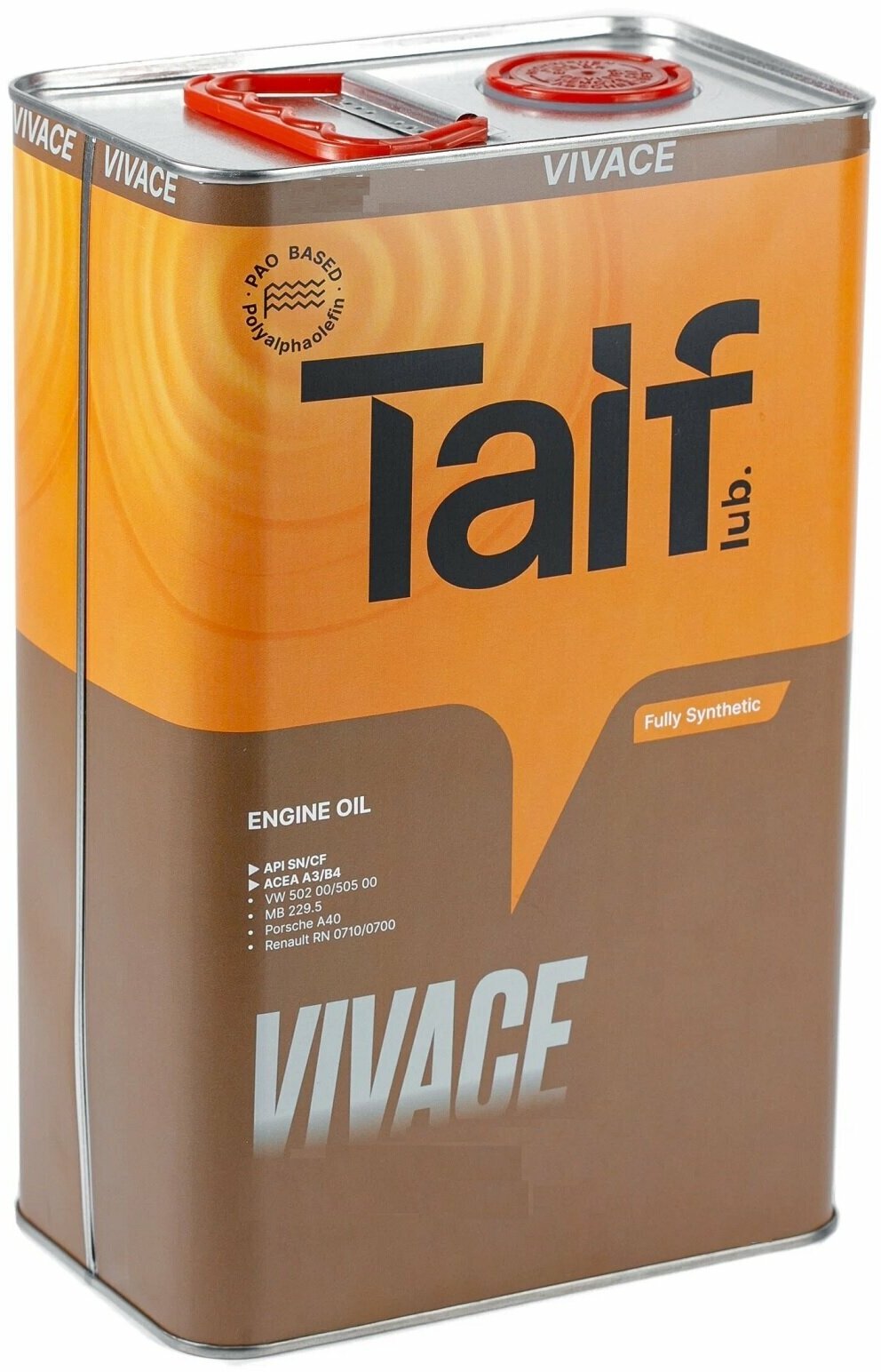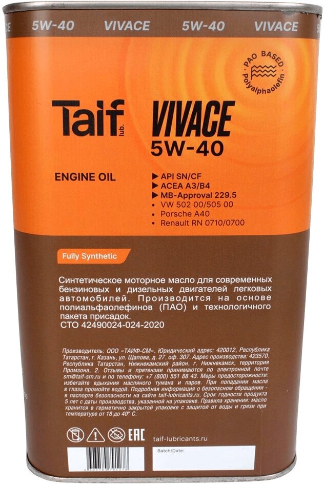 Синтетическое моторное масло TAIF VIVACE SN/CF 5W-40, 4 л, 3.8 кг, 1 шт