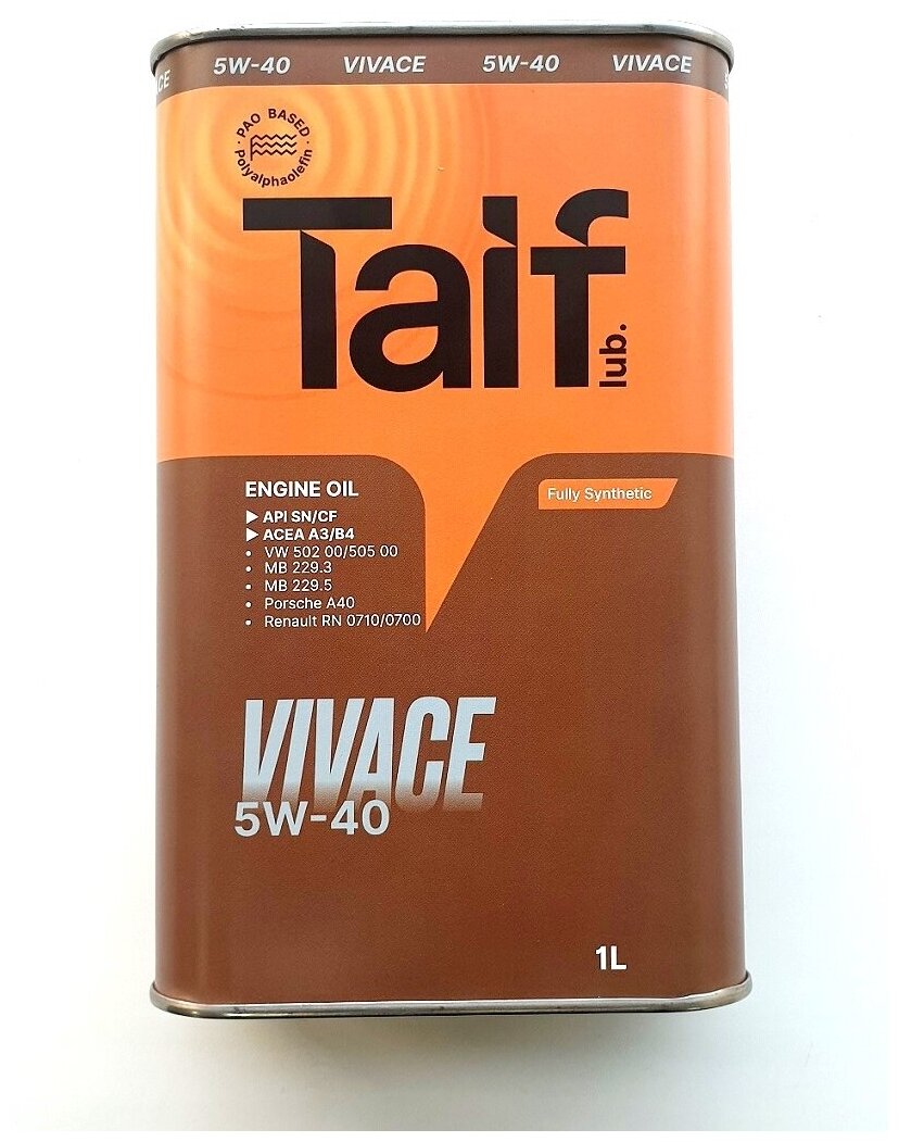 Моторное масло TAIF VIVACE 5W-40 Синтетическое, ПАО, A3/B4, SN/CF, 1 л