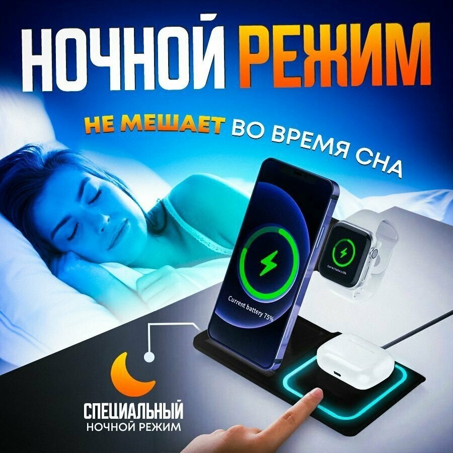 Беспроводная док -станция 3 в 1 для телефонов и умных смарт часов для айфона Samsung, Xiaomi, часов, телефона 3 в 1 Alidani черная интересное: