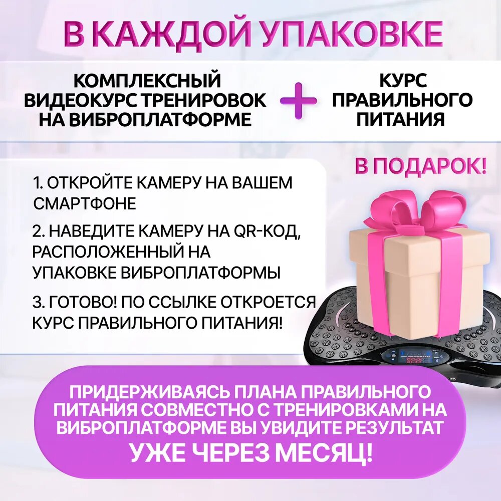| Подробная комплектация | Инструкция - 1 шт.; Шнур питания - 1 шт.; Виброплатформа - 1 шт.; Пульт управления - 1шт.; Эспандеры - 2 шт.; QR-код с курсом правильного питания - 1 шт. |