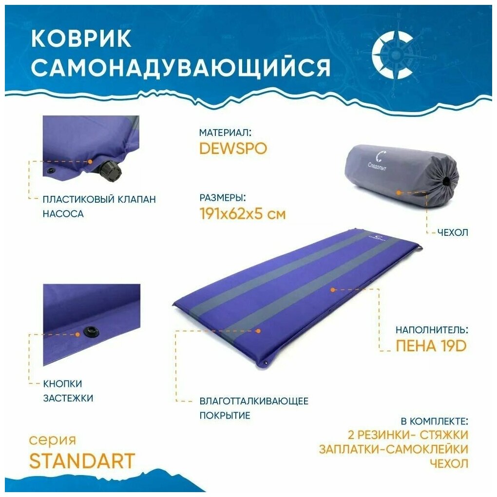 Коврик самонадувающийся "следопыт" 192x63x3 cм, стандарт, цв. синий/серый