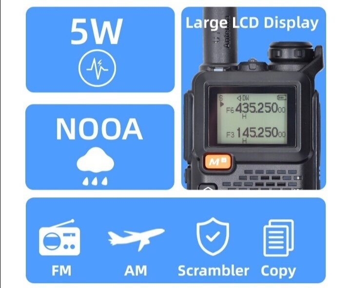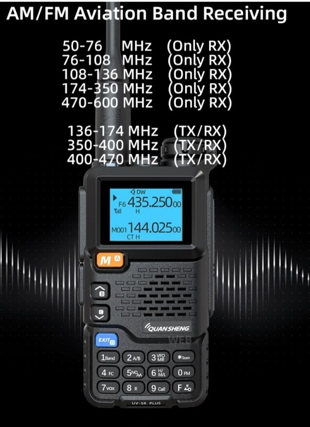 | Диапазон частот | FRS, LB, LPD, PMR, UHF, VHF, авиационный диапазон, морской диапазон, речной диапазон |