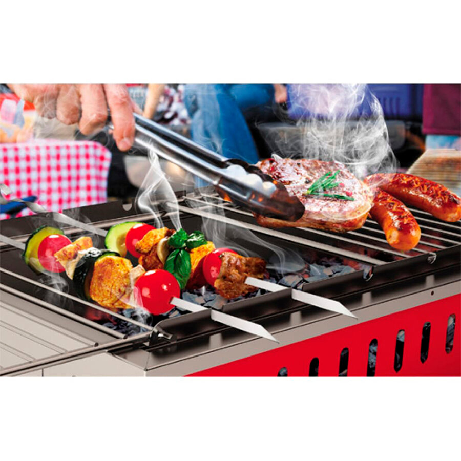 Ножки странно крепятся, точнее просто вставляются, не подрегулируешь. Металлическая вставка под уголь от температуры меняют свою форму и проваливается. Шампуры надо докупать, как и средства для ухода.
