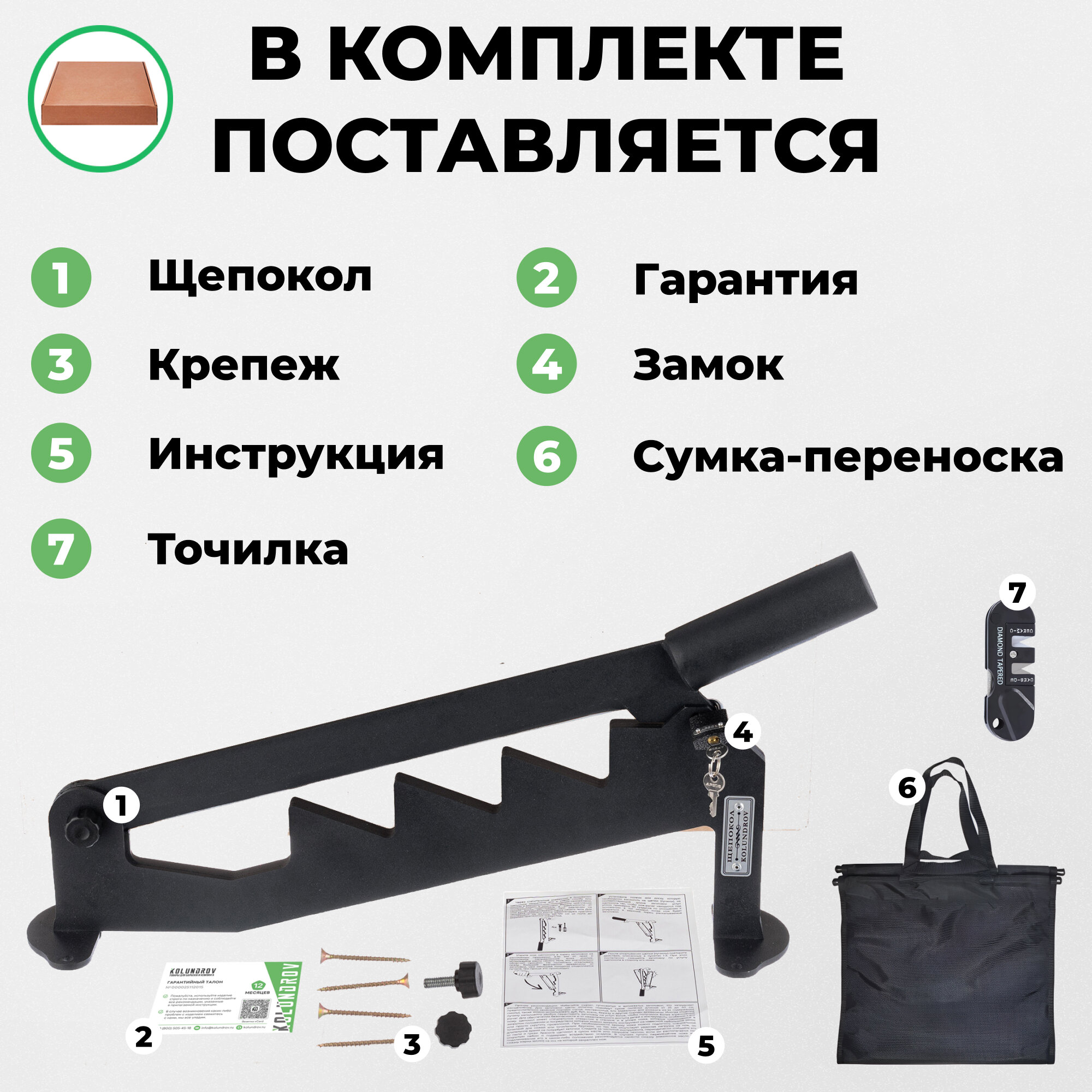 | Дополнительная информация | Комплектация набора, настенный ручной щепокол, универсальная точилка для инструмента, сумка-переноска для дров, замок с комплектом ключей, крепеж, инструкция, гарантийный талон, фирменный короб из гофрокартона с ручкой для переноски |