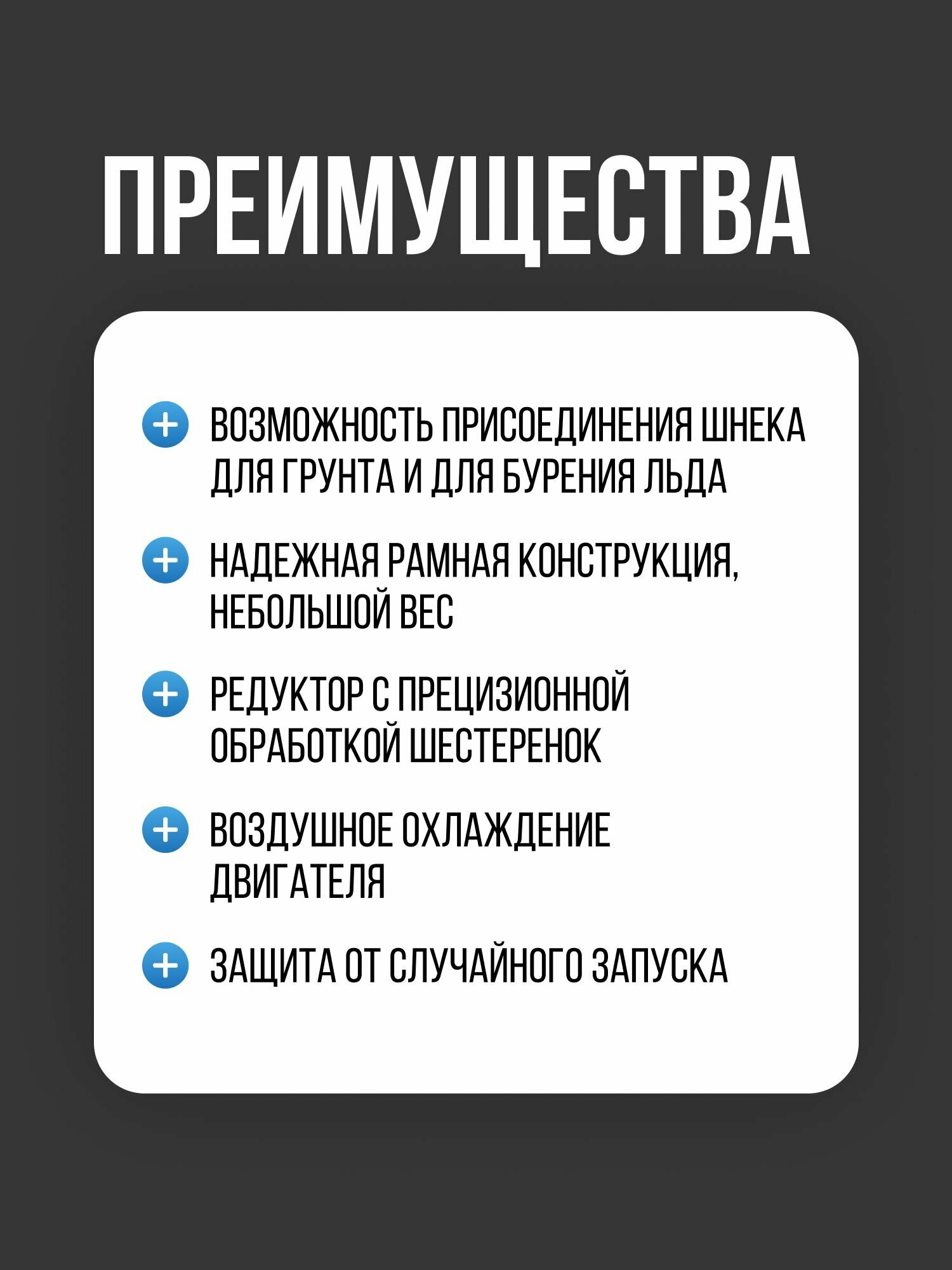 | Минусы: | Разработчики не удосужились переделать глушитель, движок как есть от бензотриммера, соответственно выхлоп вверх в лицо. Установлен экранчик якобы меняющий в сторону направление выхлопа, но в любом случае половина в лицо. при бурении вначале лицо сбоку - норм. когда погружаете бур в любом случае наклоняетесь над ним. поэтому встаете так чтобы ветер сдувал выхлоп и немного отворачиваете лицо и т.к. работа тяжелая, то на последнем этапе можно просто прервать дыхание на несколько секунд. |