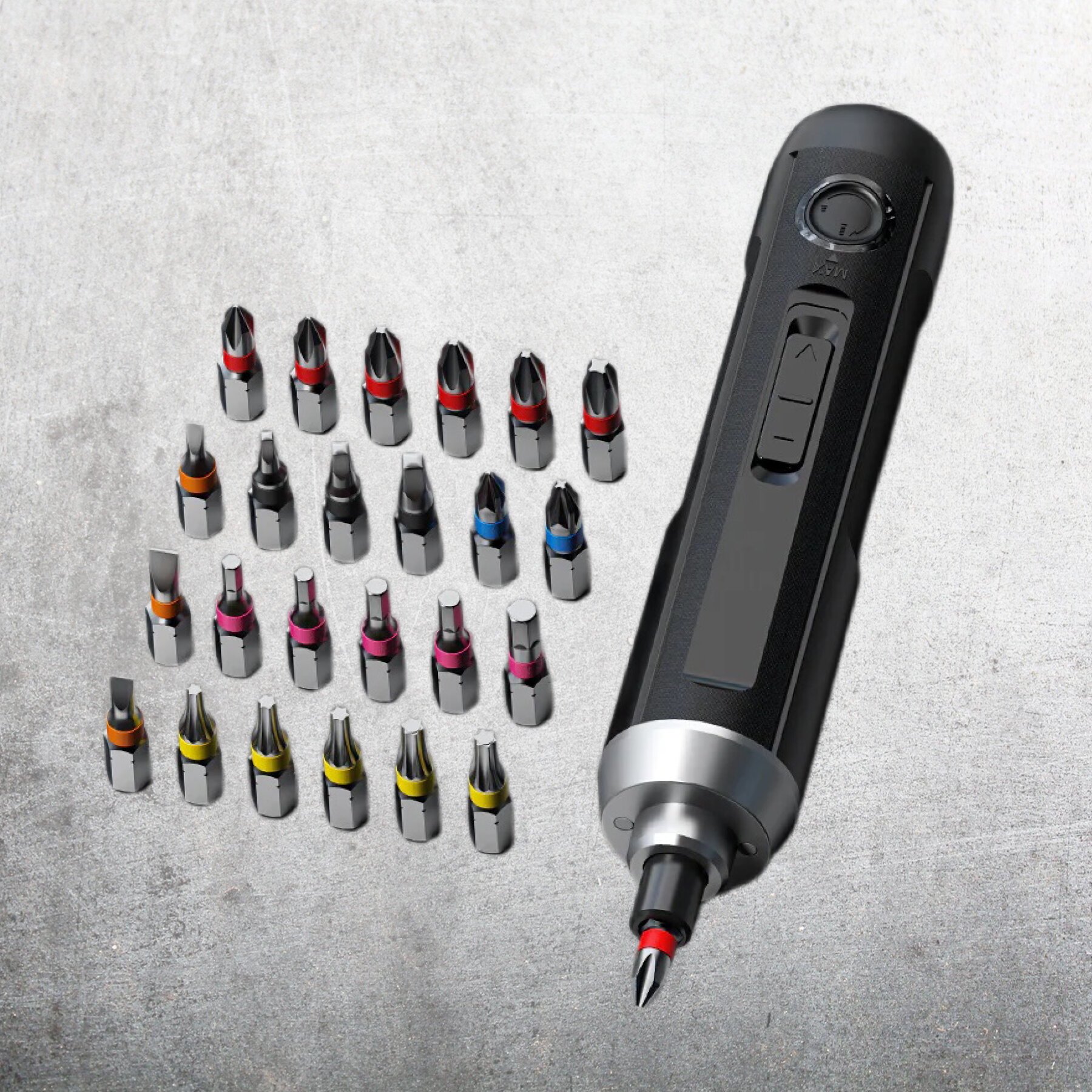 Отвертка аккумуляторная прямая Deli DL-DP04-E1B2 + набор бит 24шт + магнитный удлиннитель (3,6В, 2А/ч, 5Нм, реверс, подсветка, кейс)