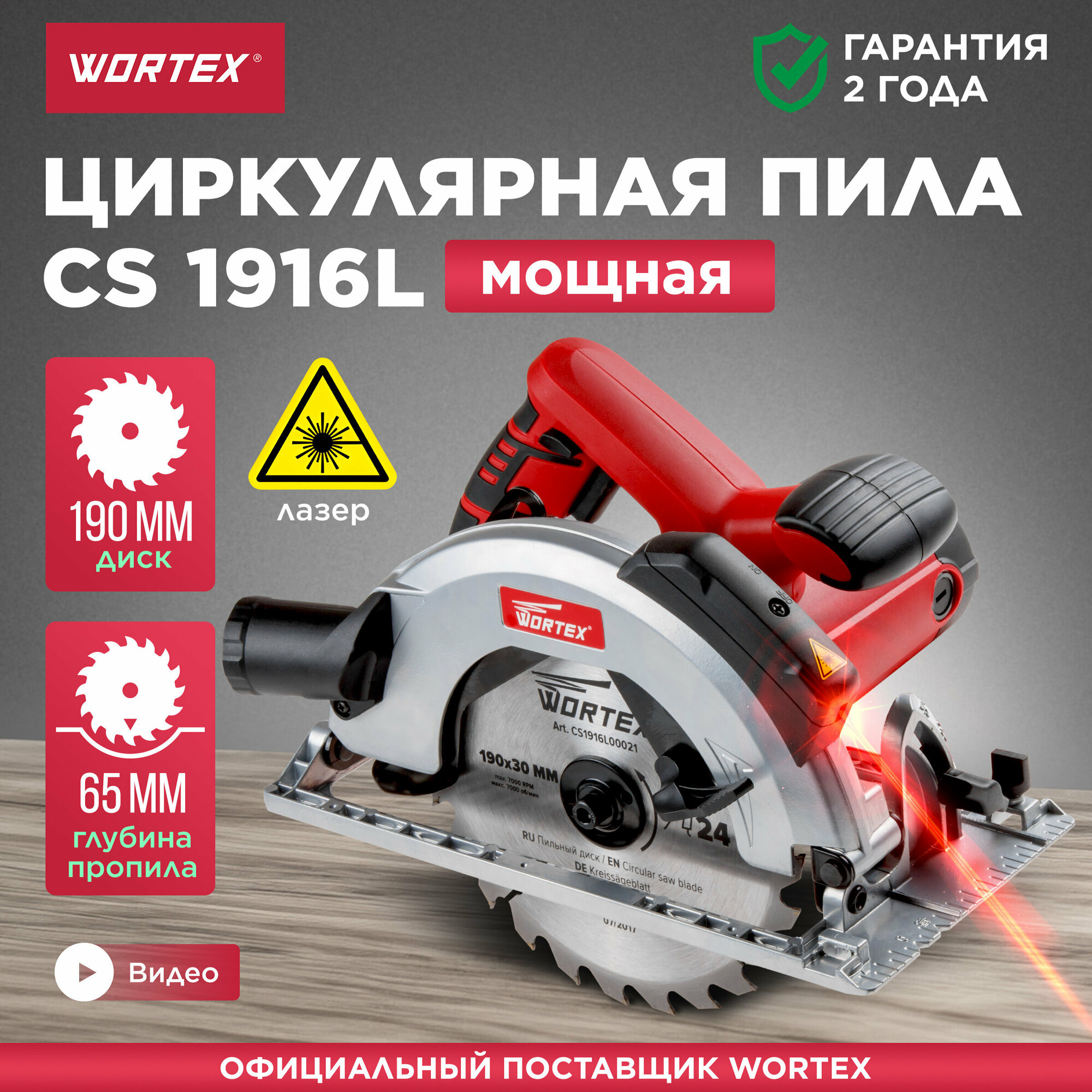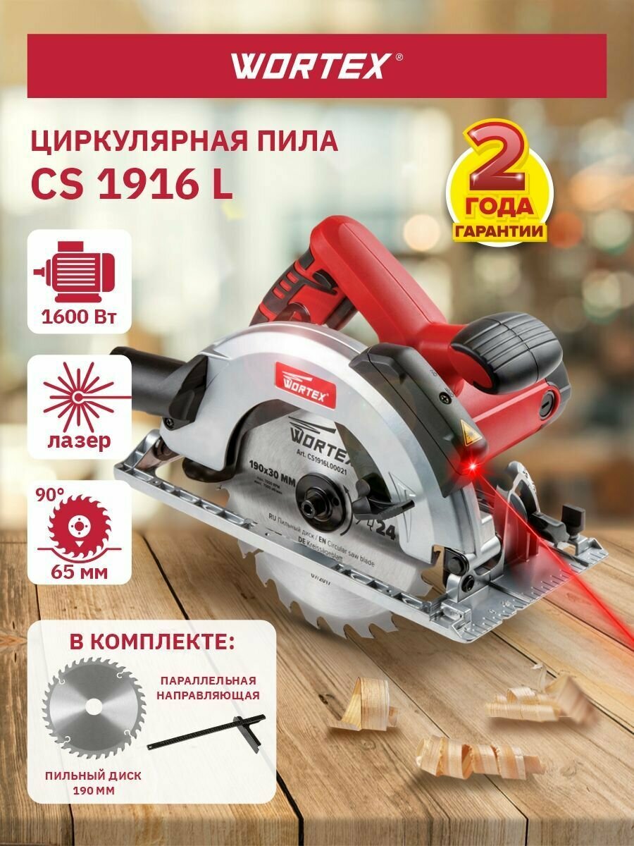 Циркулярная пила WORTEX CS 1916 L в кор. 1600 Вт, 190 мм, до 65 мм, лазер, литье (CS1916L00021)