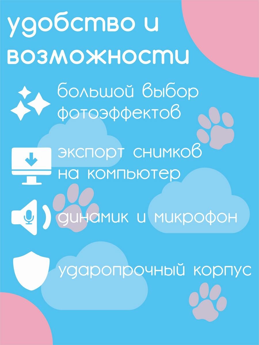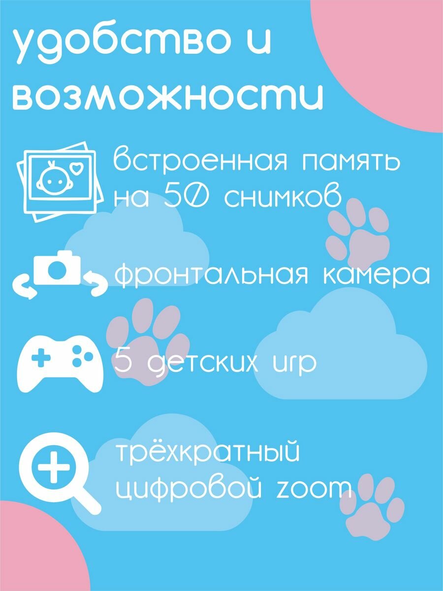 | Комплектация | детская цифровая камера, зарядный кабель, Кард-ридер, руководство, шейный ремешок |