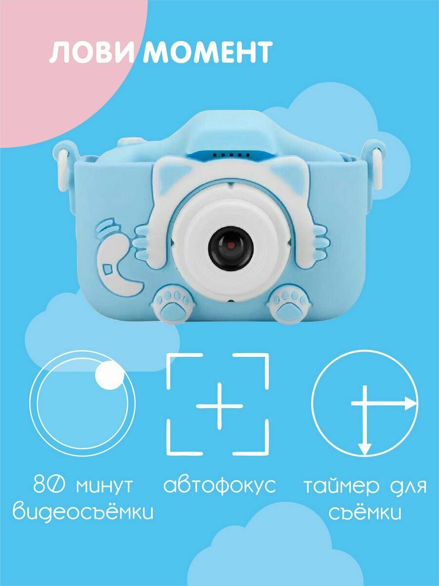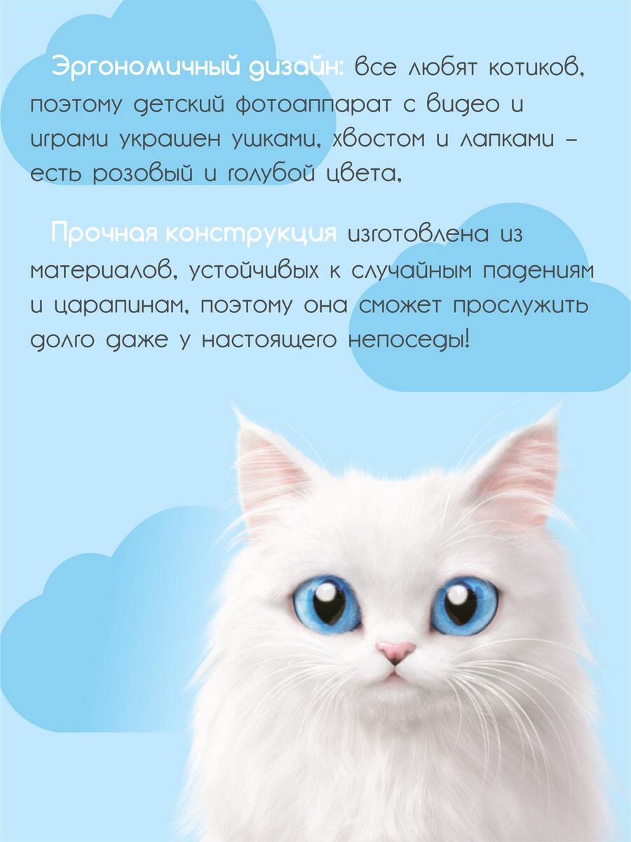Купить Ударопрочный детский фотоаппарат для девочек 1080p Full-HD со встроенной памятью цифровая камера с 3 играми и селфи, Кitty голубой
