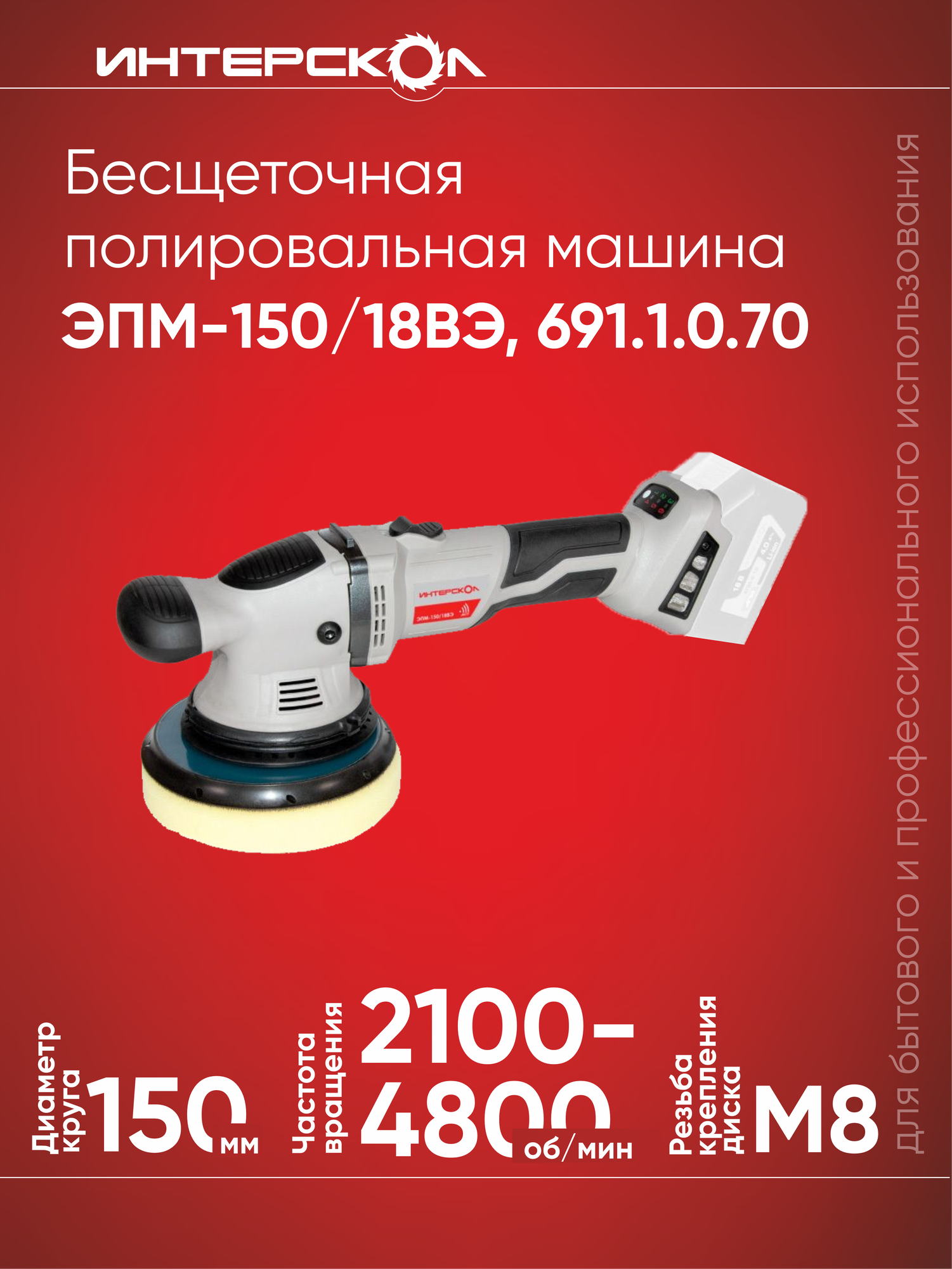 Бесщеточная профессиональная аккумуляторная полировальная машина Интерскол ЭПМ-150/18ВЭ (картон, без аккум. и ЗУ)