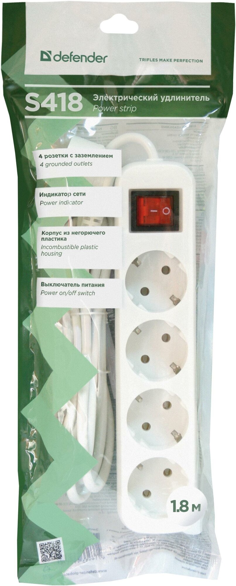 Удлинитель Defender S418, 4 розетки, с заземлением, выключатель, 1.8м, белый