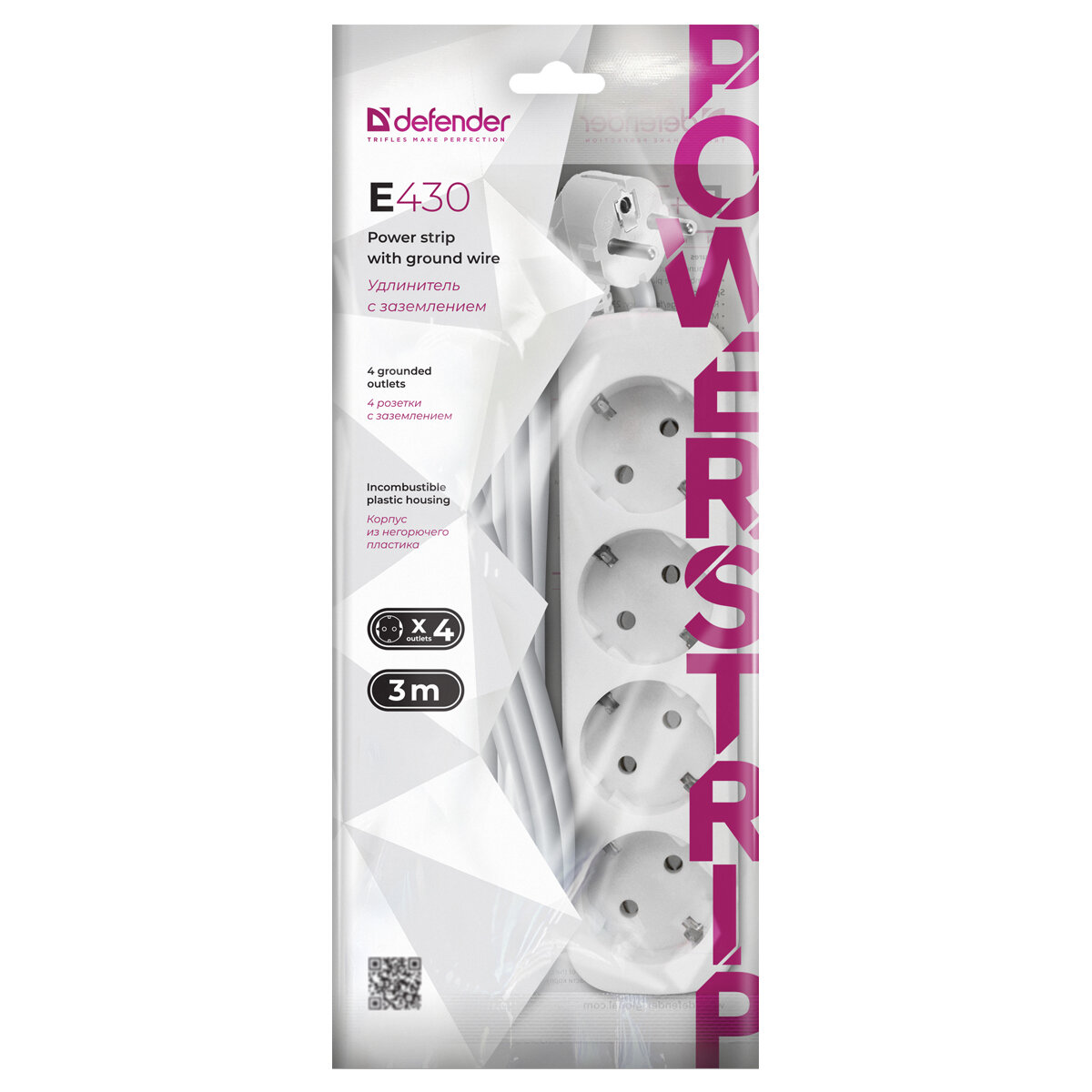 Удлинитель Defender E430, 4 розетки, с заземлением, 3м, белый