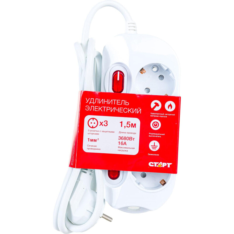 Удлинитель бытовой старт 1,5м 3-местный с/з 3х1кв мм белый