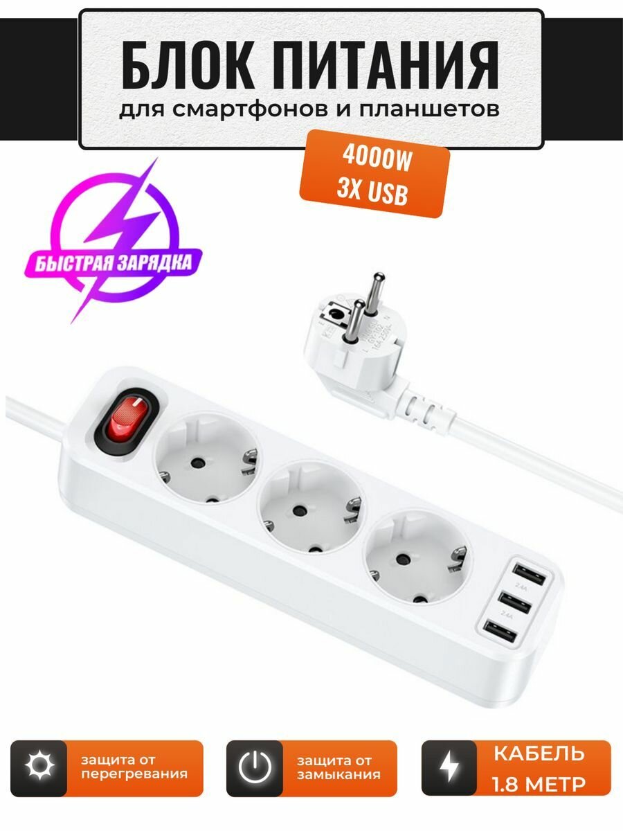 Сетевой фильтр удлинитель Hoco NS2 высокой мощности 4000W, 3 розетки + 3 USB 5V / 2.4A, 1.8м, белый