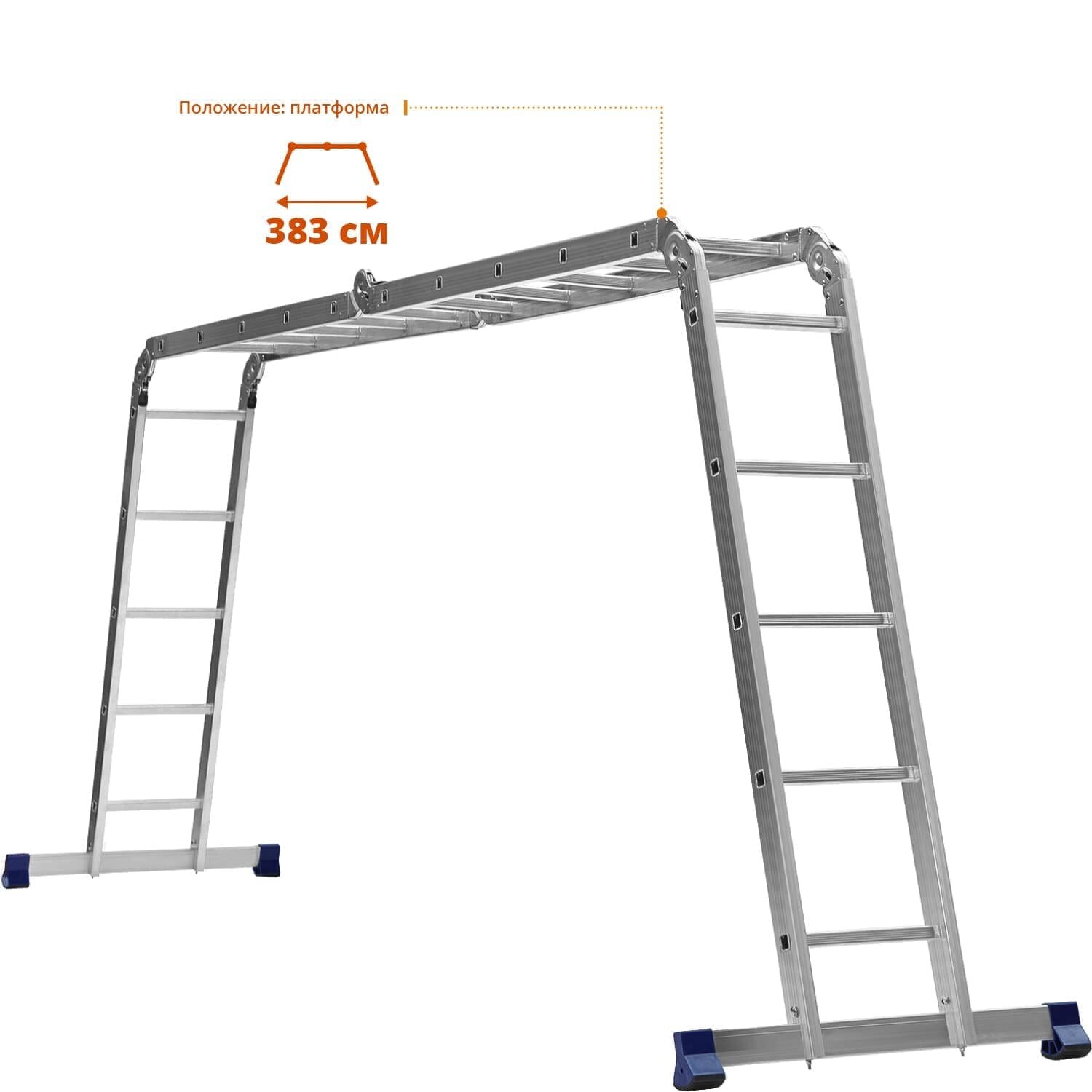 | Дополнительная информация | трансформация: стремянка, платформа, приставная лестница, г-образная лестница; размер профиля: 63х25х1.25 мм, 60.2х22.5х1.5х2.0 мм; стальные шарнирные соединения с замками; рифленые ступени, размер профиля ступеней 25х25х1.25 мм; съёмные траверсы шириной 80 см с противоскользящими пластиковыми опорными наконечниками |