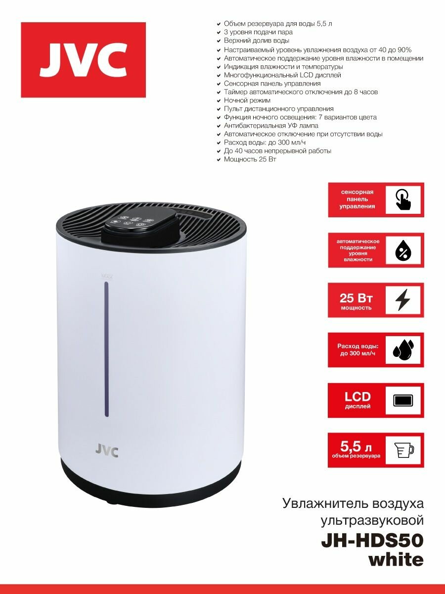 Купить Увлажнитель воздуха ультразвуковой JVC JH-HDS50 white с сенсорным управлением, 3 уровня подачи пара, УФ-лампа, ночник 7 цветов, пульт ДУ, 25 Вт