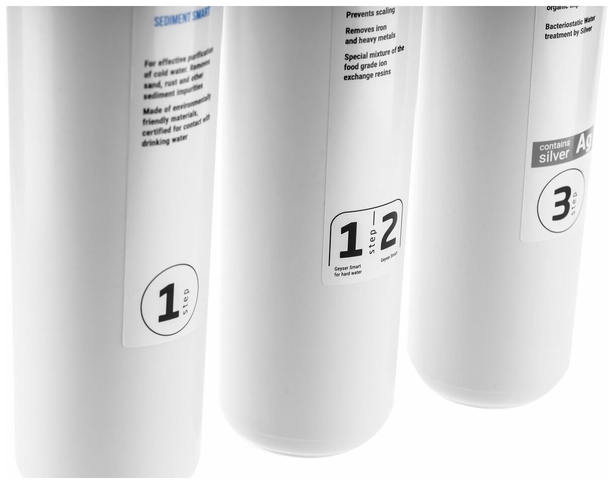 | Дополнительная информация | картриджи в наборе: 1) механика смарт – вспененный полипропиленовый картридж для механической очистки питьевой воды от нерастворимых примесей; 2) умягчитель смарт – ионообменная смола пищевого класса. удаляет соли жесткости; 3) посткарбон ag смарт – содержит высококачественный кокосовый уголь и материал каталон. удаляет хлор, органические и хлорорганические |