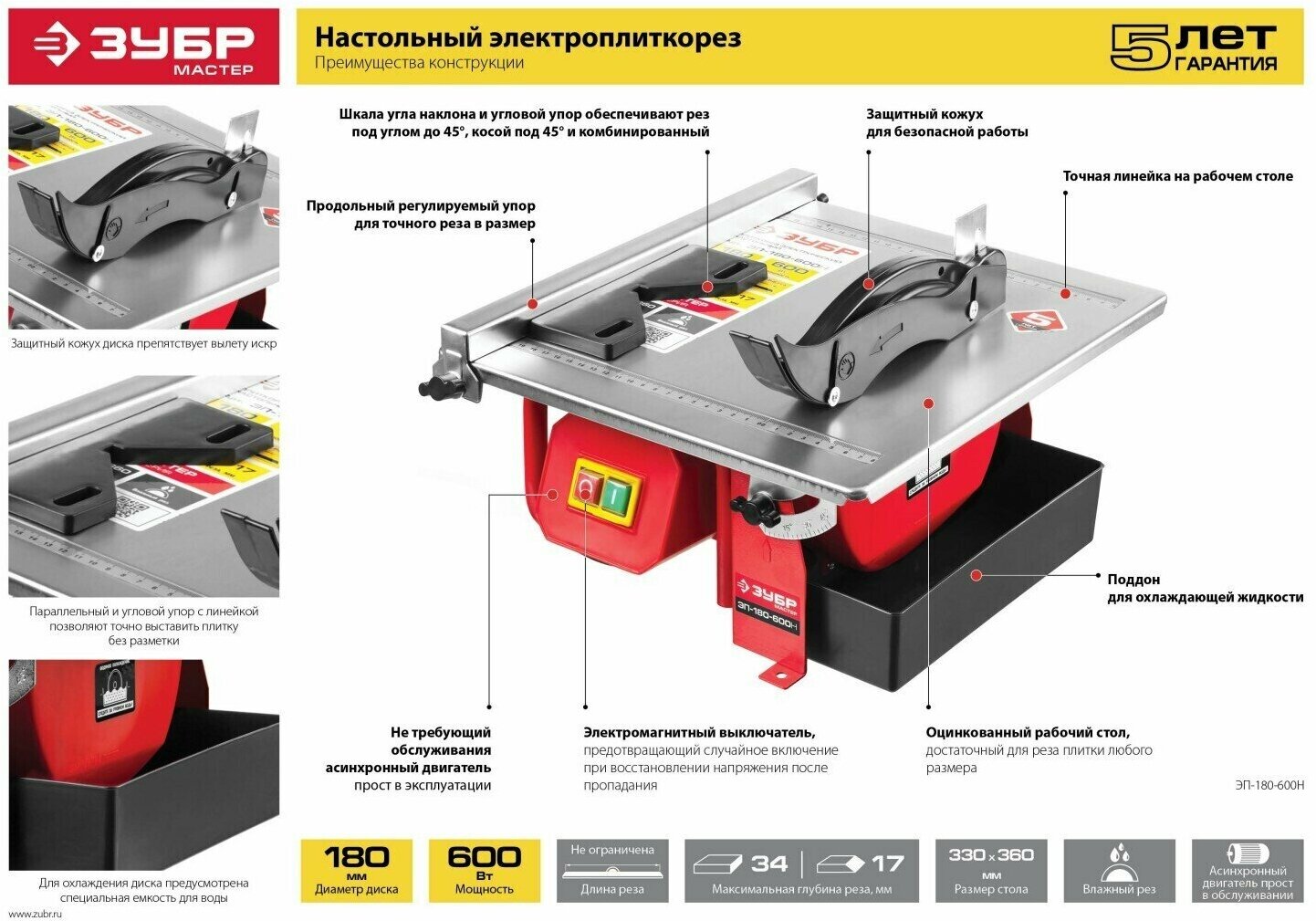 Электроплиткорез ЗУБР "Мастер", диск 180 мм, глубина реза 90°-34мм/45°-17мм, стол 330х360мм, 2950об/мин, 600Вт