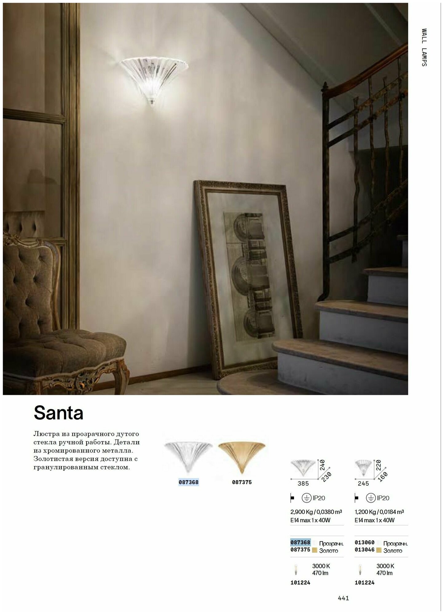 Светильник настенный ideal lux Santa AP1 Small макс.1х40Вт IP20 Е14 230В Золото Стекло/Металл Без лампы 013046. интересное: