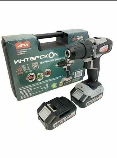 Дрель-шуруповерт аккумуляторная ИНТЕРСКОЛ ДА-13/18ВК 45 комби (АПИ, бесщёточный привод, Li-ion, кейс, 1,5Ач, 2 аккум., ЗУ)