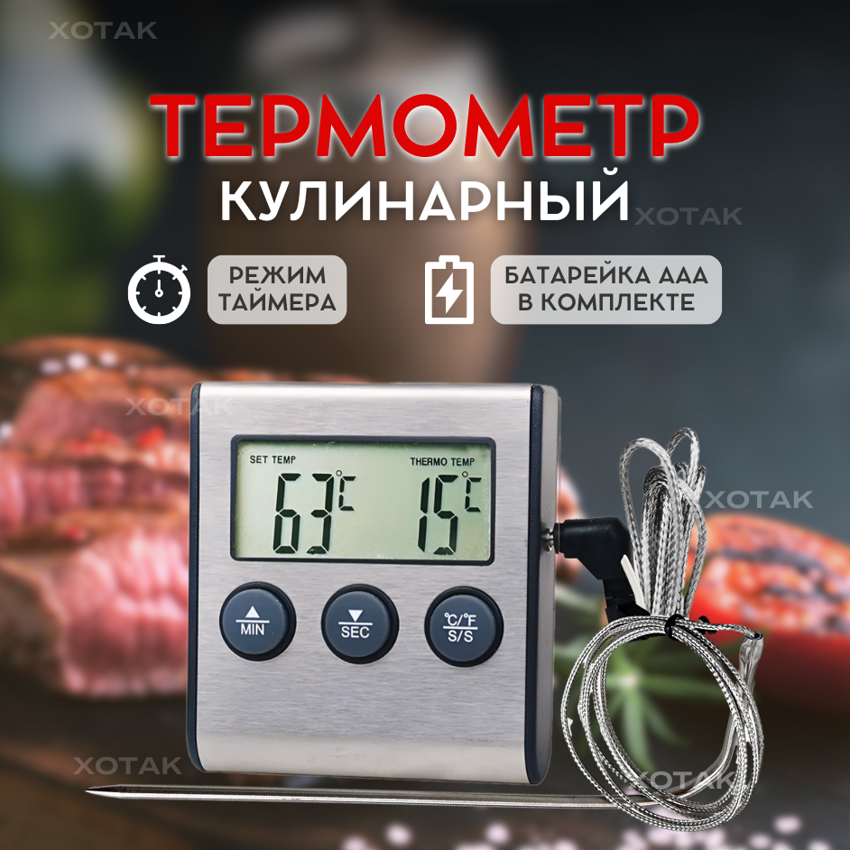 Кулинарный термометр электронный со щупом из нержавеющей стали, термометр для еды, мяса, вина, провод 1 метр / таймер кухонный